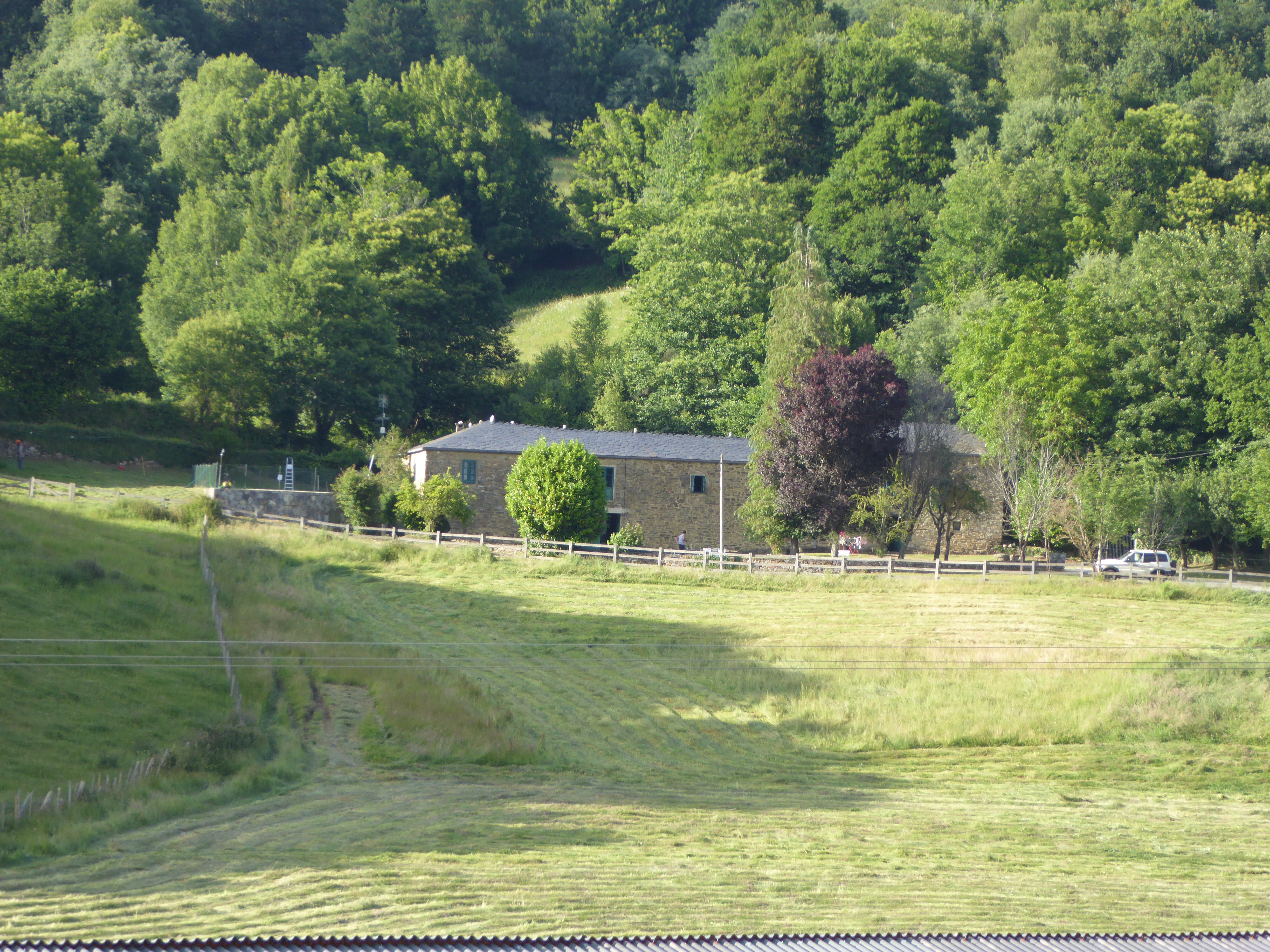 This was to be a very gentle walking day as at one point Christian and Savilla and their Dad were going to join us for three days. With this in mind, Delana tried to choose shorter distances between stops and fairly level terrain. When the plans changed we left the schedule the same—or so we thought…… We are truly in rural Galicia. On our way to Samos ( 9 km) most of our walk was through a forest, passing by small isolated villages of abandoned houses.There were cows in the pastures but few people about. It was very peaceful and we walked most of the way lost in our own thoughts. We were happy to arrive in Samos for coffee, to find our casa rural and to plan the rest of our day. Enjoying our coffee, Rod decided to check on the directions to our hotel, discovering that it was not in Samos at all but down the road a further 8 km!! It was early yet, and Samos has a famous Benedictine Monastery, so we decided to visit it before resuming our journey.The San Xulian Monastery was built in the 6th century, ( in Galacia “J” becomes “X”), and has a combination of Renaissance, Late Gothic and Baroque architecture.in its massive construction. Throughout the history of the Camino it has granted refuge and care to pilgrims. Today San Xulian remains an active monastery, but there are still beds for pilgrims, or for those seeking a spiritual retreat. Then it was onto Gorolfe and our accommodation. This was a dark walk as the thick, overhead foliage prevented the sun from penetrating. It was also very secluded— no structures, no people, no cows, even—a bit eerie.. We were depending on Rod’s ” personal guidance system”, which has served us well thus far, to find our casa rural. Finally, after a trek going up and down steep valleys and through a recently mown farm field, we miraculously arrived.at Casa Diaz. We are in the middle of no where in a semi luxurious, rustic retreat. ( This sounds like an oxymoron, but you have to see this place to understand…..) Tomorrow we will worry how to best find our way out of here.