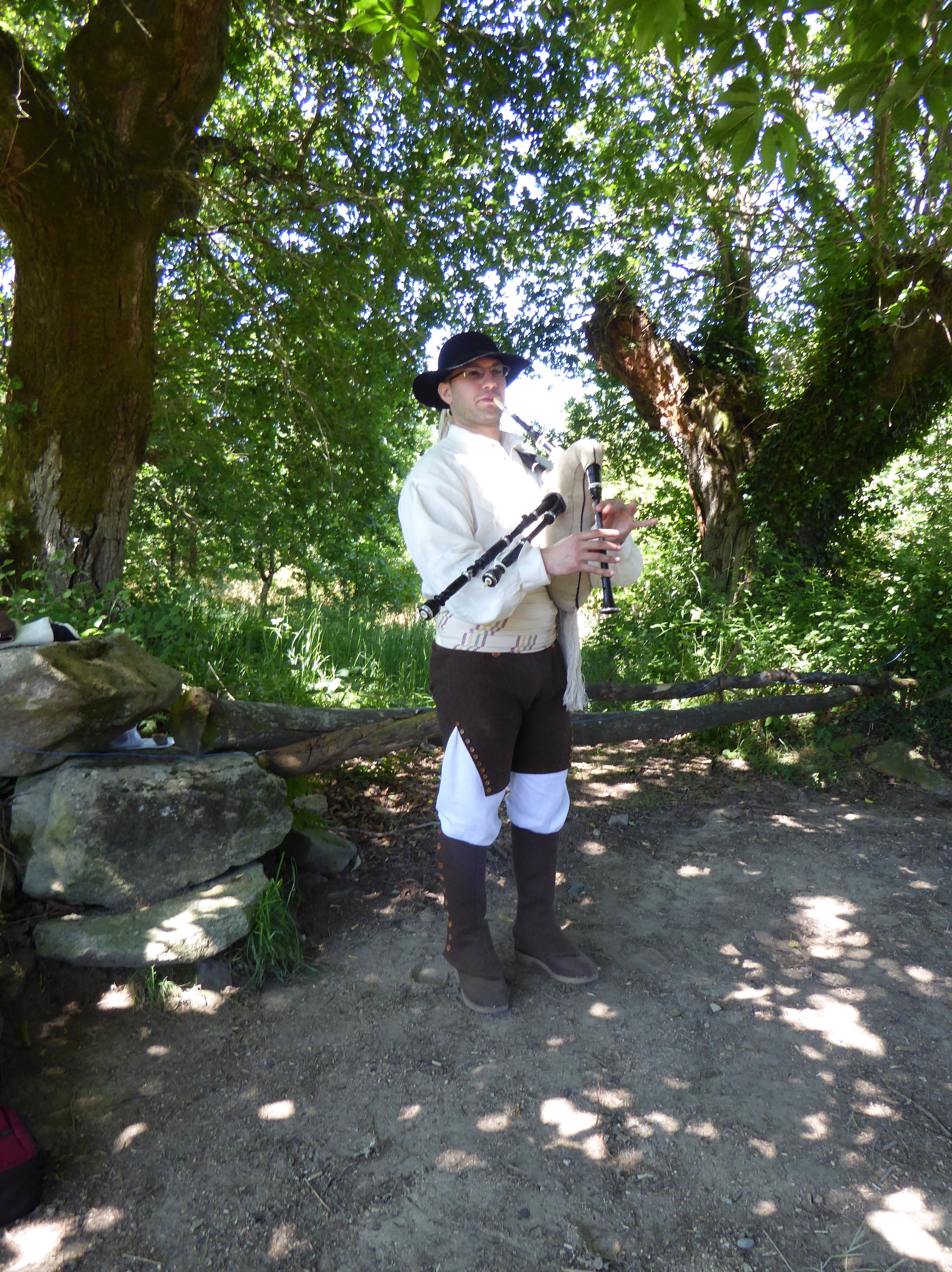 A Galician piper, playing the Gaita Gallega – a Galician bagpipe.
