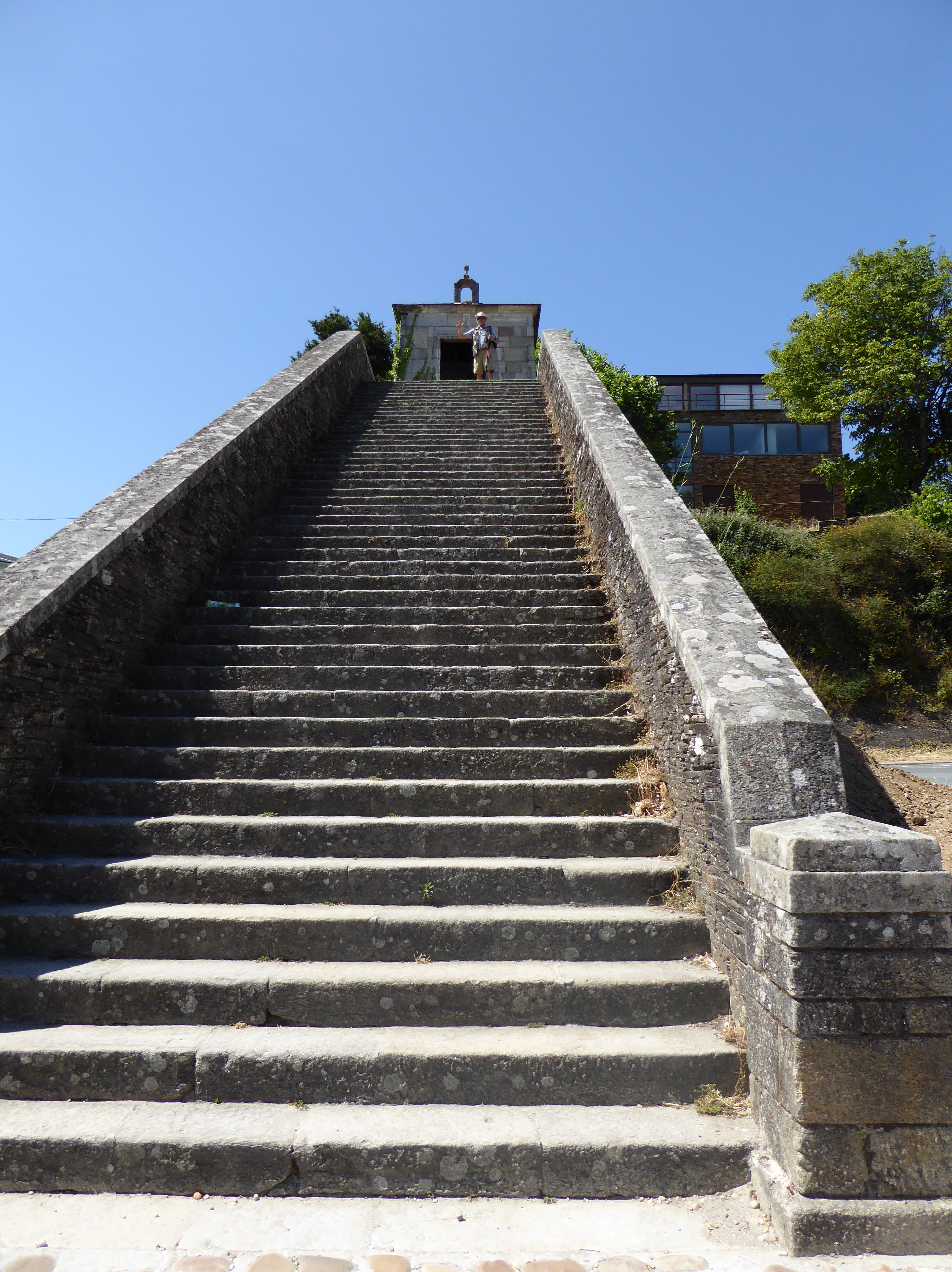 After a considerable climb we reached Portomarin crossed the bridge and were met with about 50 steep stone stairs leading into town. Old Portomarin, dates from Roman times but no longer exists—well it does exist but it is under water. In the 60’s a dam was built on the Mino River and flooded Portomarin. Cherished churches were dismantled and rebuilt rock by rock on the high ground where Portomarin stands today. In the autumn when the reservoir waters are low the old Roman bridge and the remains of the old town can be seen above water. This must be a strange feeling to those who lived there.