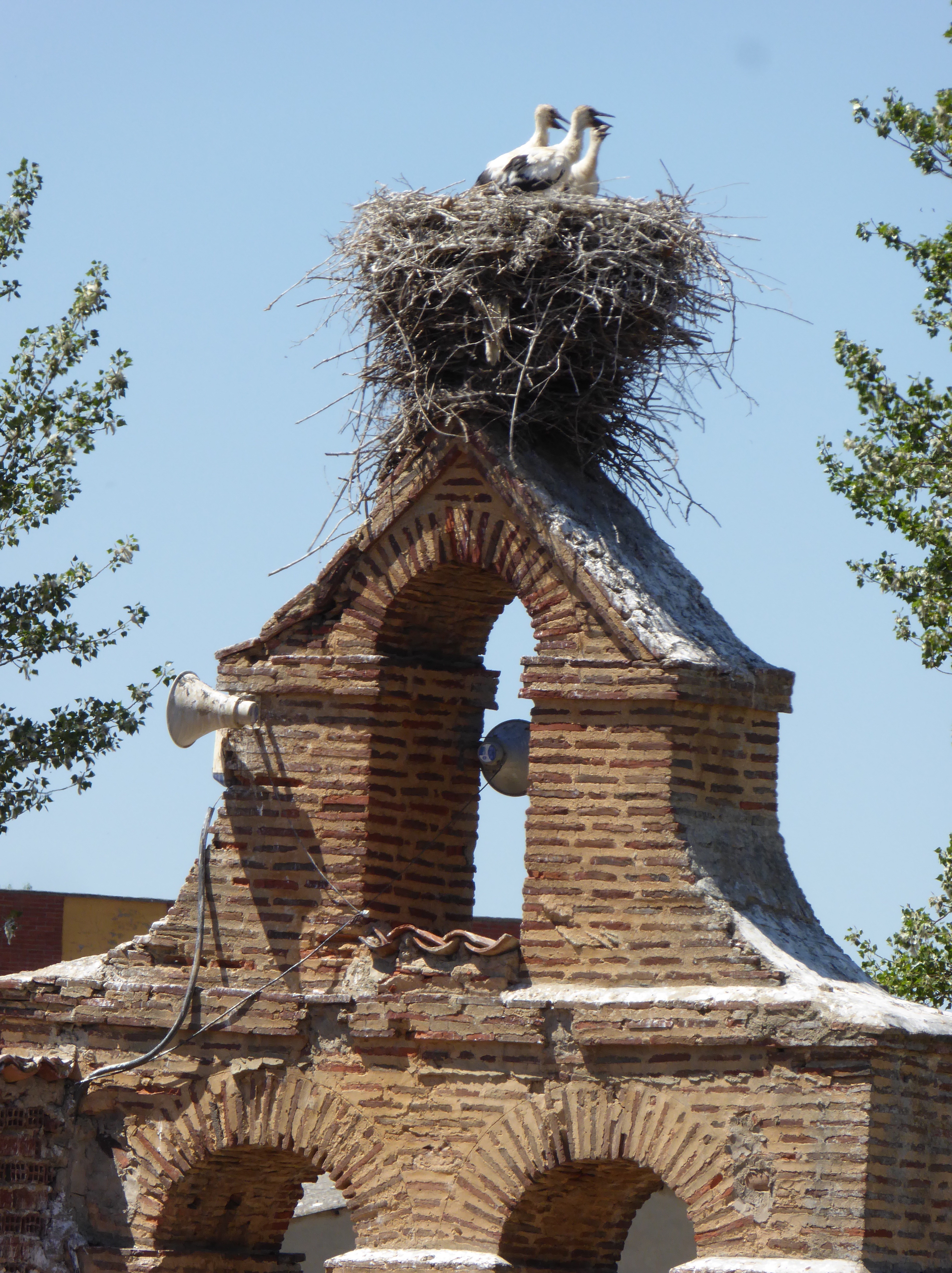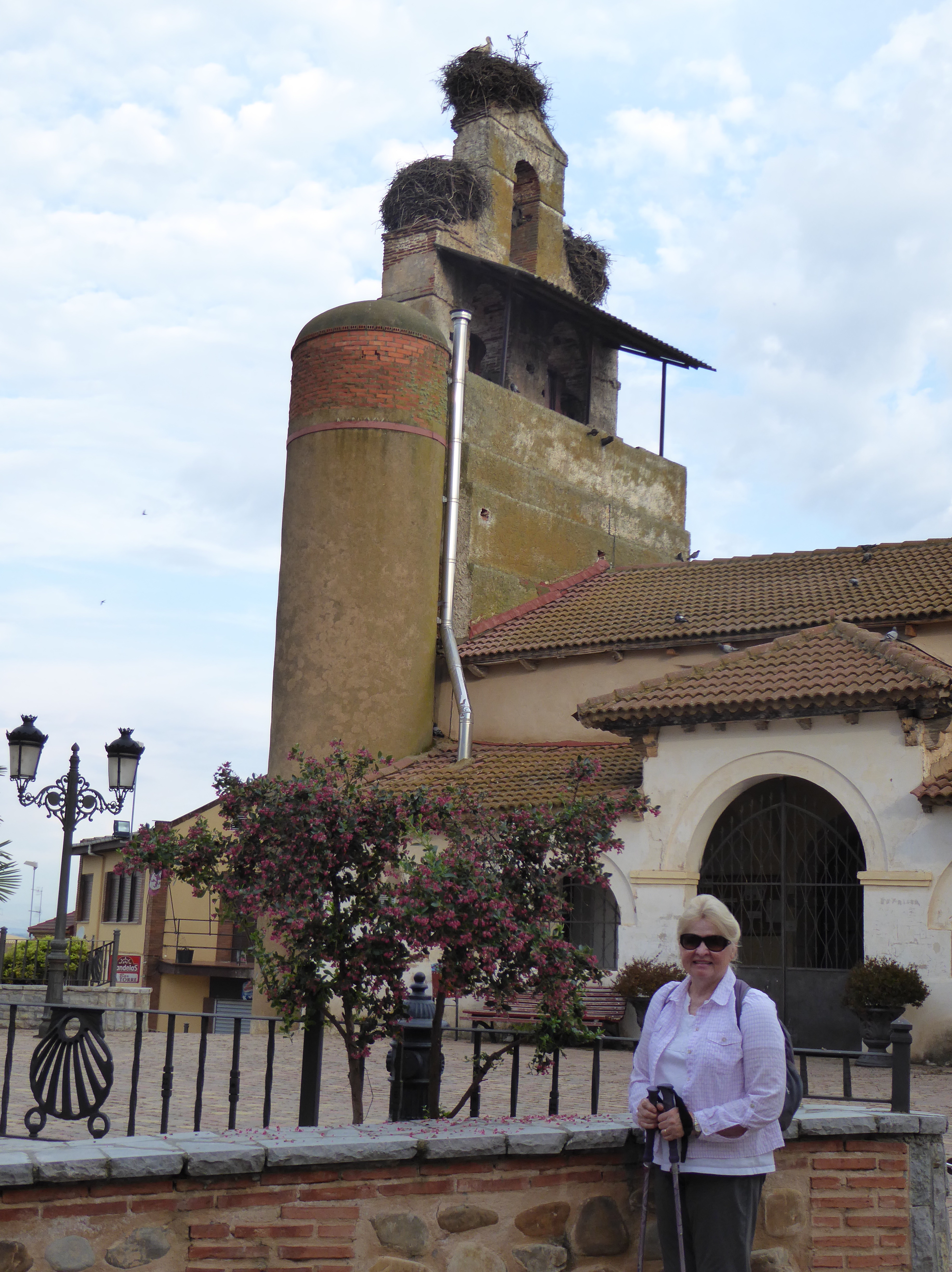This also became “stork” day. Almost every church we passed had a resident stork family. This was fascinating to us as storks in Canada are rare—in North America they may be seen at Pelee Pt.,Ontario, the southernmost spot in Canada, some southern states and Mexico. They are considered mute but do communicate by clacking their bills which can be quite raucous. Their nests are large and used year after year by the same storks. The ones we are seeing are white storks, although there are also black storks in Spain which are now on the endangered species list. Storks in a Spanish village are considered good luck😊