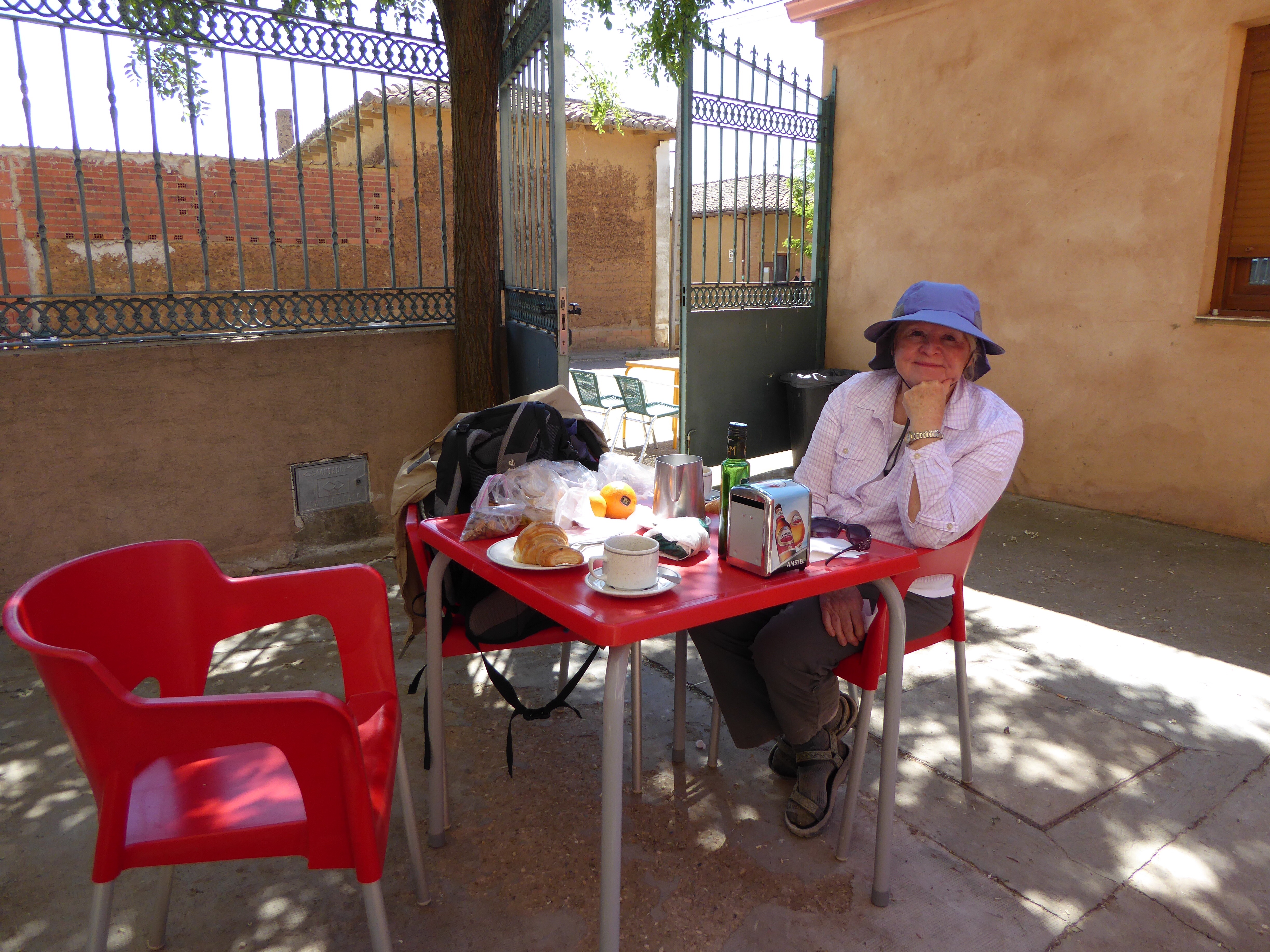 Being a Sunday morning before Mass, the town of Sahagun was still asleep when we were searching for a morning coffee to get us on our way. Rod helped a restauranteur put out his tables and chairs in exchange for brewing some coffee for us. We must have looked desperate.