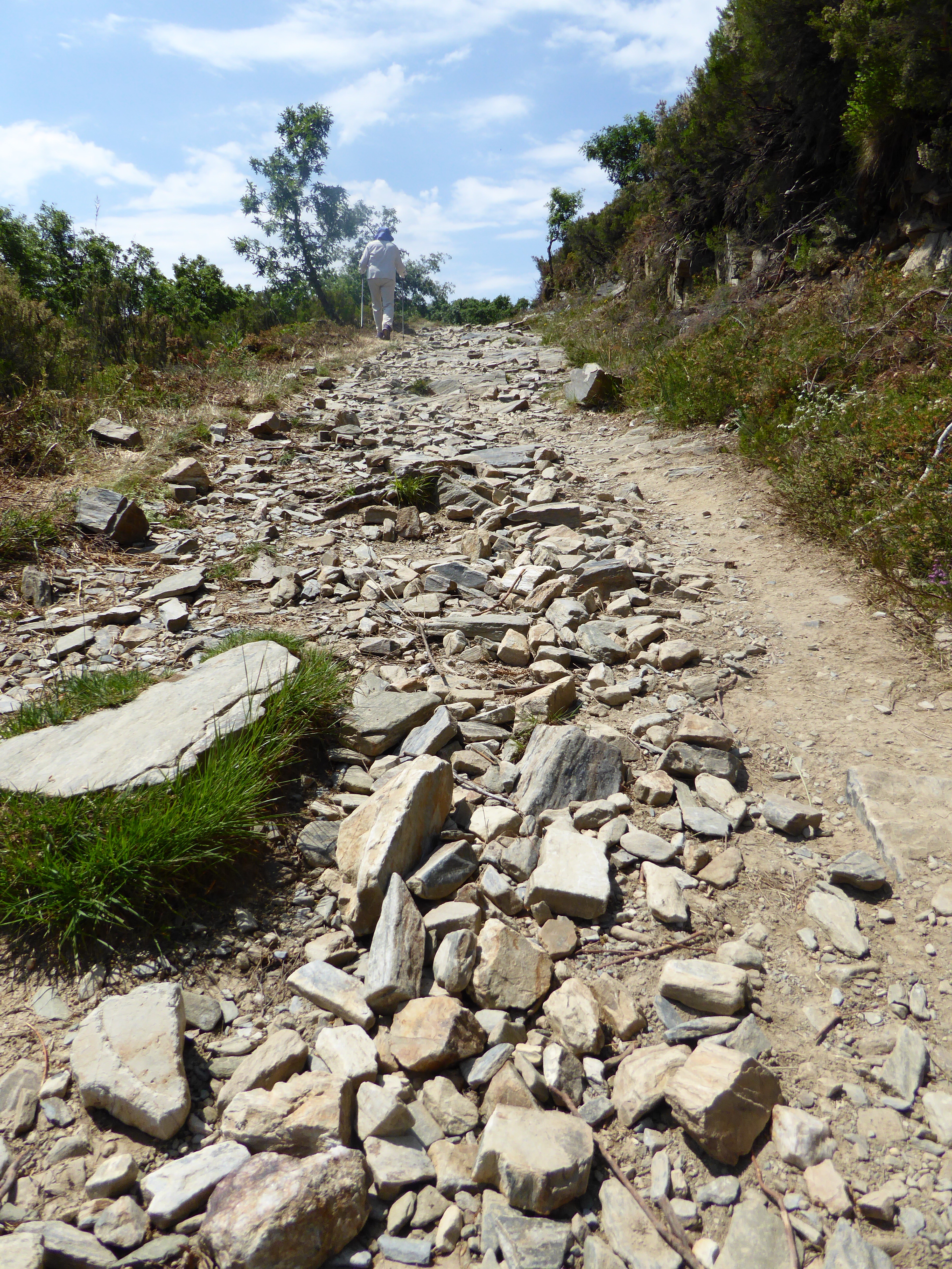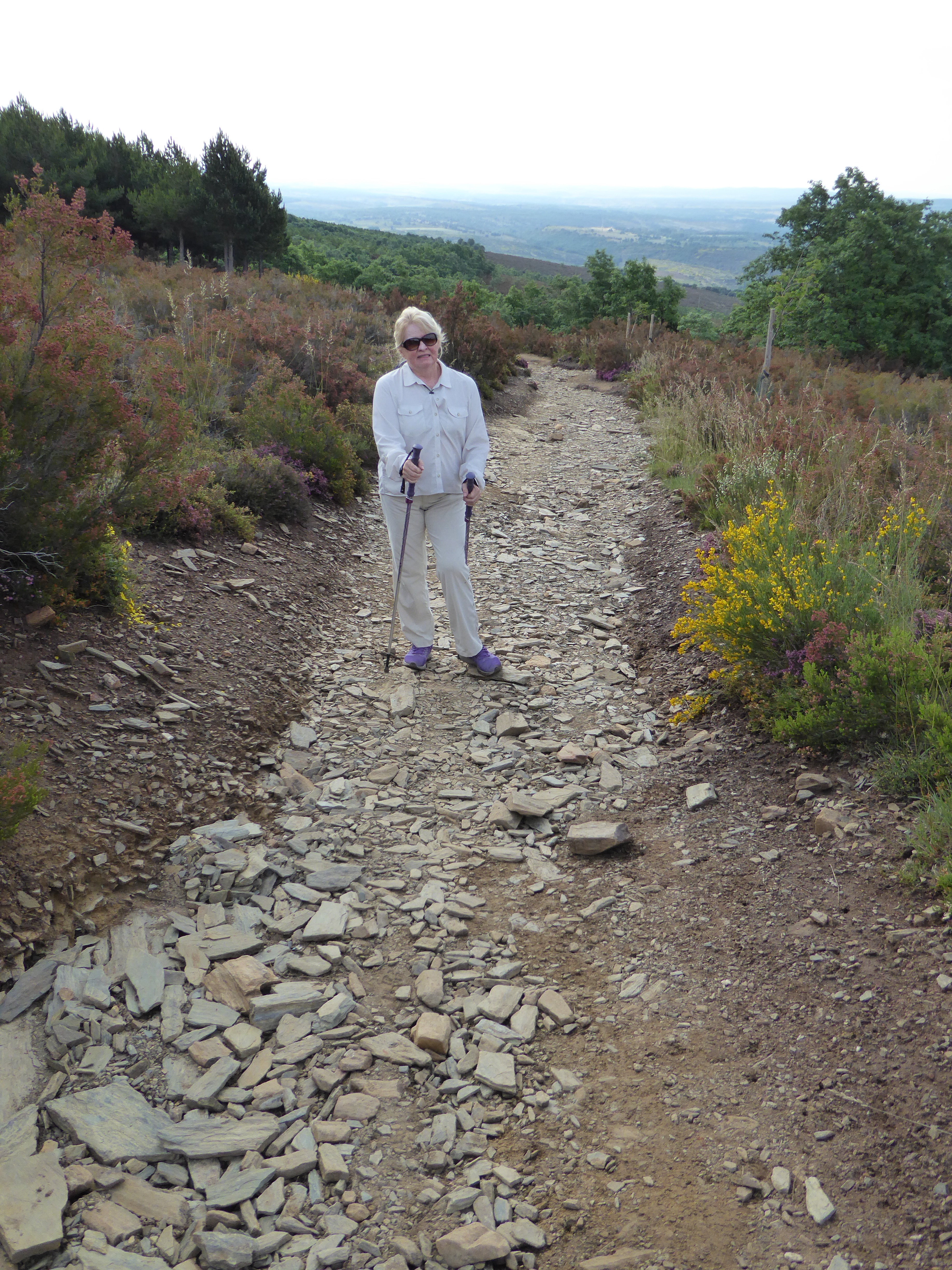 So many of the villages along the climb have literally fallen to ruin over the centuries. They were mostly stone and mud, but with slate roofs not the terra cotta tiles throughout the rest of the Camino. This is a remote alpine farming area, isolated in the winter months. The passage of pilgrims has given new life to these villages and small seasonal accommodation and restaurants have begun to appear. We reached the Cruz de Ferro (1490m or 4,888 ft) with little problem as our ascent from our village was only 450m or 1500ft. Cruz de Ferro is an iron cross atop a 5 metre wooden pole and is one of the most emblematic monuments on the Camino. Pilgrims bring a stone from home and place it at the base with the many thousands already there. Leaving a stone is a way of leaving behind a burden, letting go of something in your life, or simply a symbolic gesture of reverence. It is an emotional few minutes despite the fact that pilgrims have begun leaving all sorts of items not only rocks, resulting in a bit of a trash pile. We left our wishing stones found on the beach at Forever House. At Cruz de Ferro there was a young man who is a paraplegic pilgrim. He is doing his Camino riding a special tricycle with a place on the back for his wheelchair. This courageous human being was truly another Camino inspiration. Soon after beginning the descent (925 m or 3,035 ft) we called upon these examples of courage and determination. The way down was tortuous. It was like a goat trail of loose, large rocks with huge outcroppings of slippery, broken shale. Every foot step had to be placed extremely carefully so it was slow going as the day heated up. We looked at one another in askance wondering just what we were doing here—but there was no turning back.This part of the Camino is fraught with disaster. That afternoon a young Australian pilgrim fell and was taken off the mountain to the hospital. Somehow, we both made it to Molinaseca in one piece and we gave thanks.