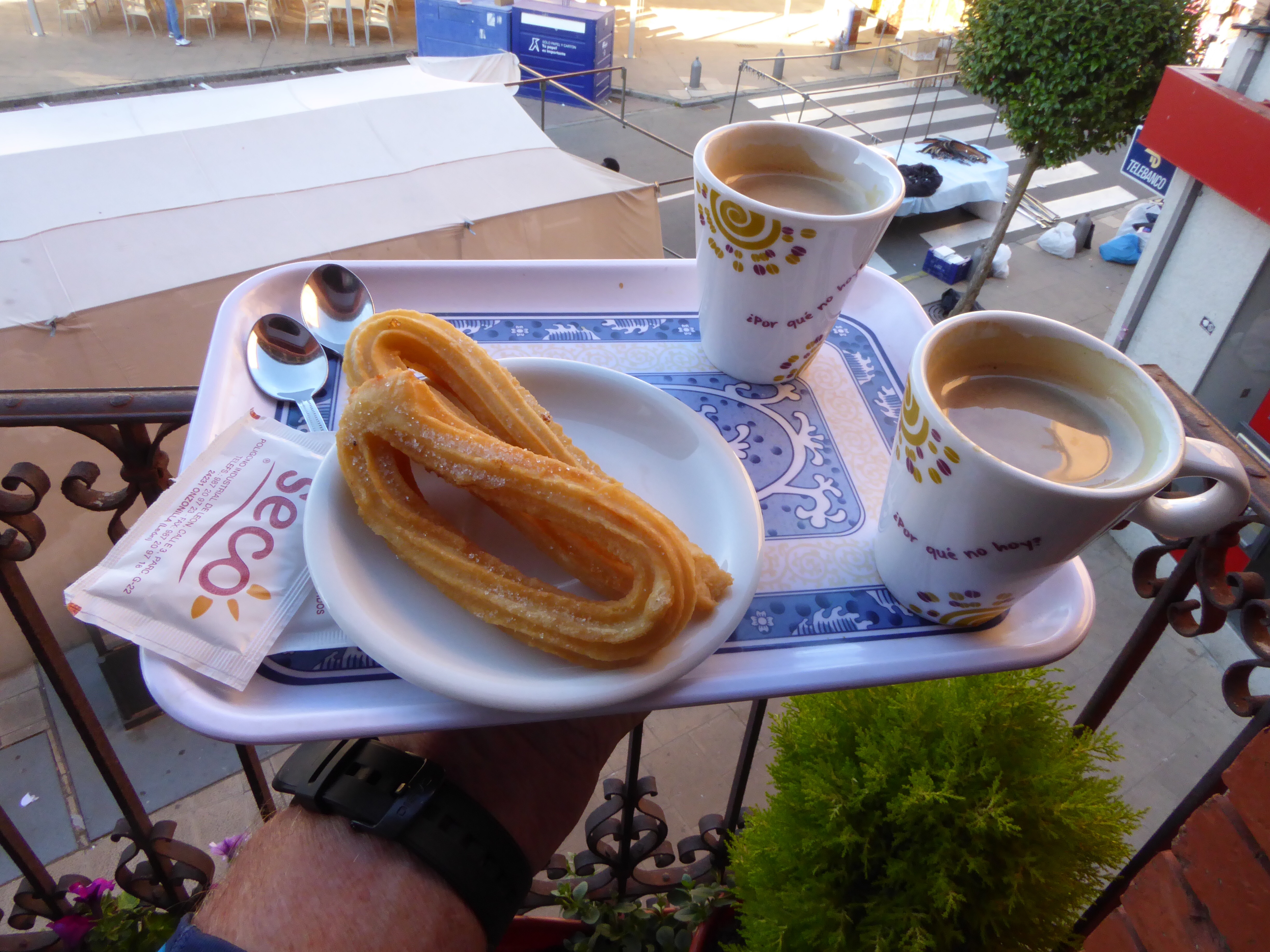 Our day began after a lovely sleep in with Rod giving up on the coffee machine in the “do it yourself” breakfast room. Instead he ran down the street to a nearby restaurant and came back with a tray complete with china cups of coffee and complimentary churros.( Spanish donuts). It seems the locals are not surprised at anything a pilgrim does😊