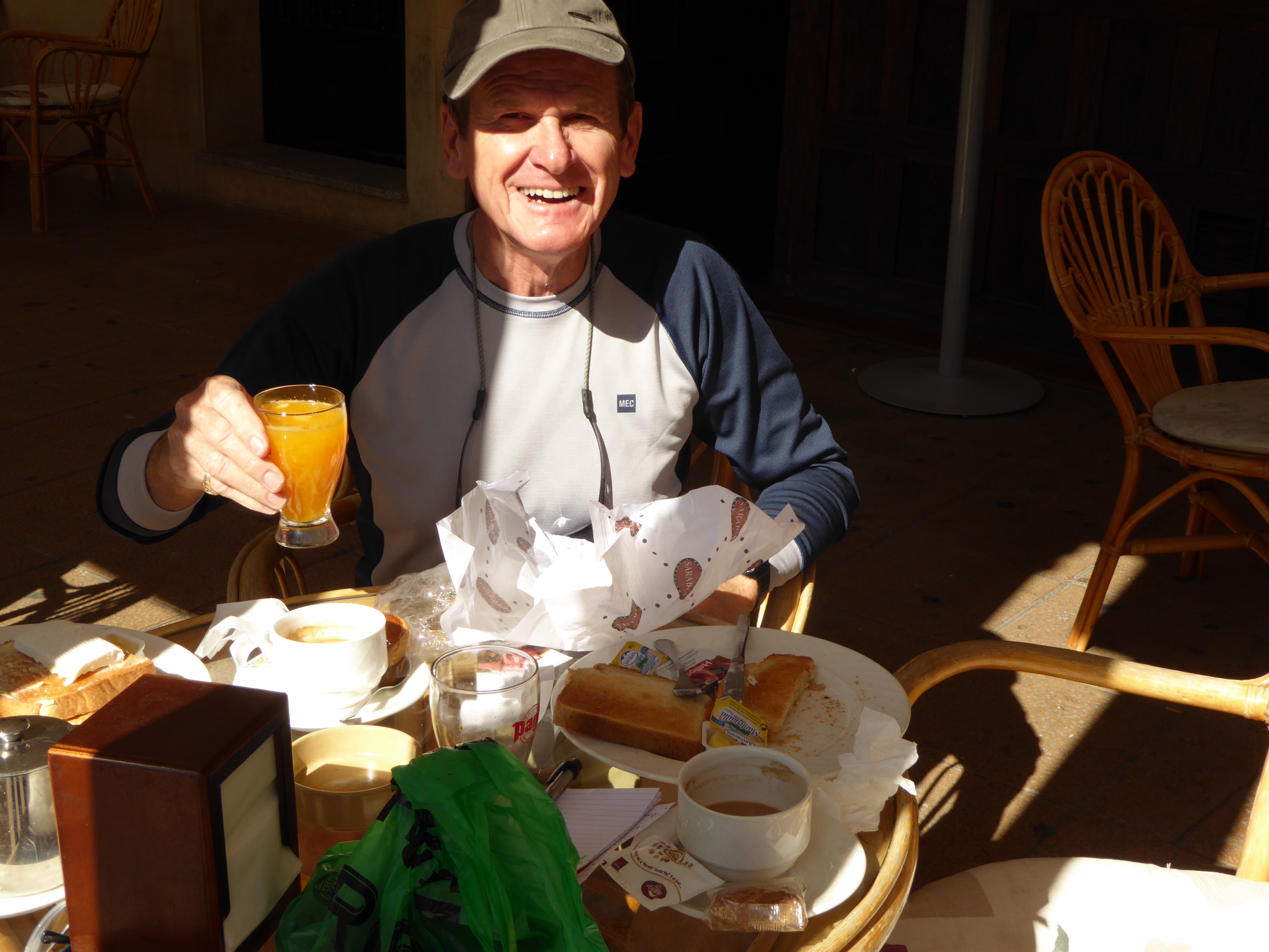 Breakfast in the town square with freshly pressed orange juice, coffee to die for and from the market, local cheese, sausage and bread. Cost  – about $10  Will address food / eating out costs later in blog.