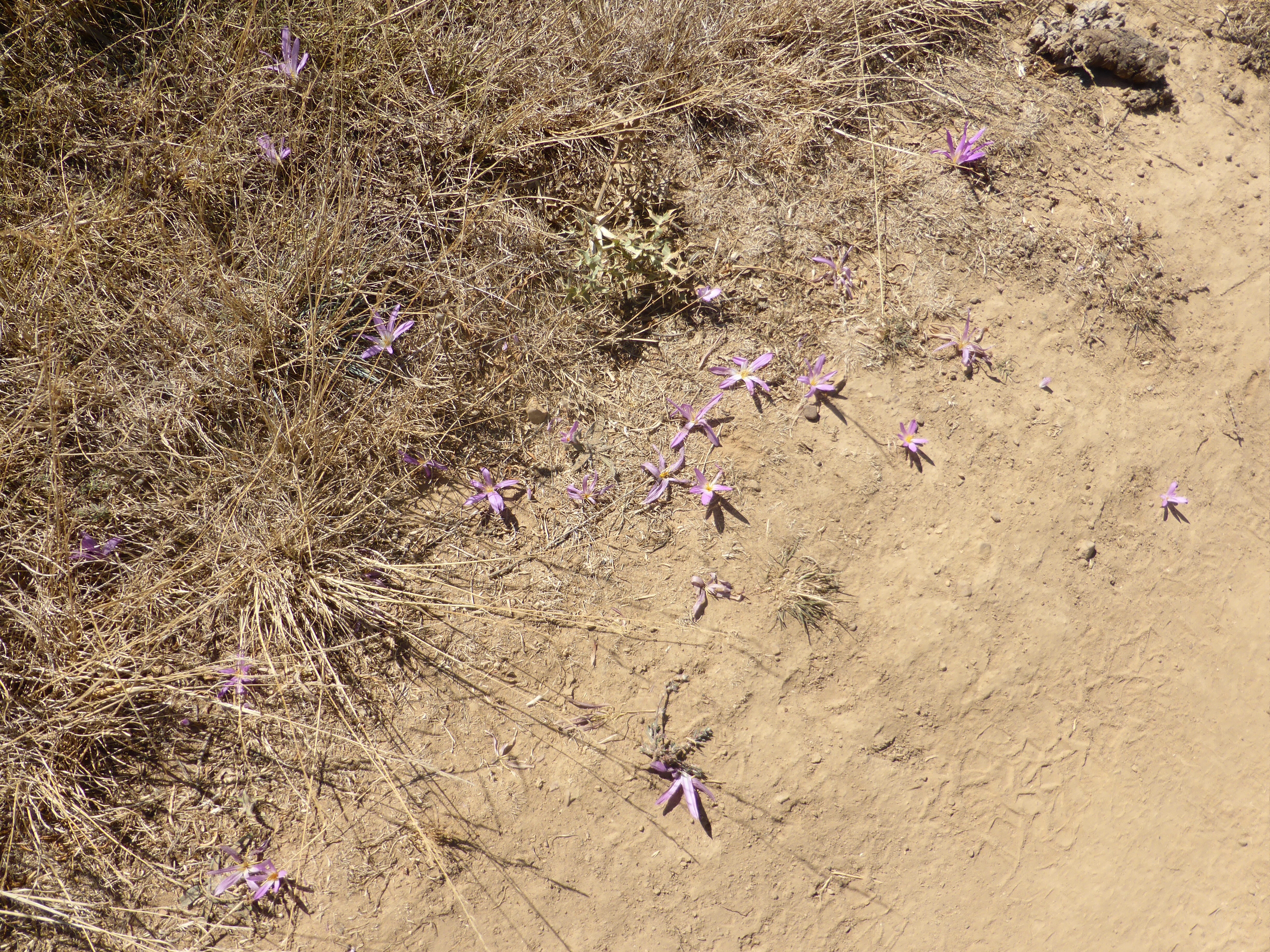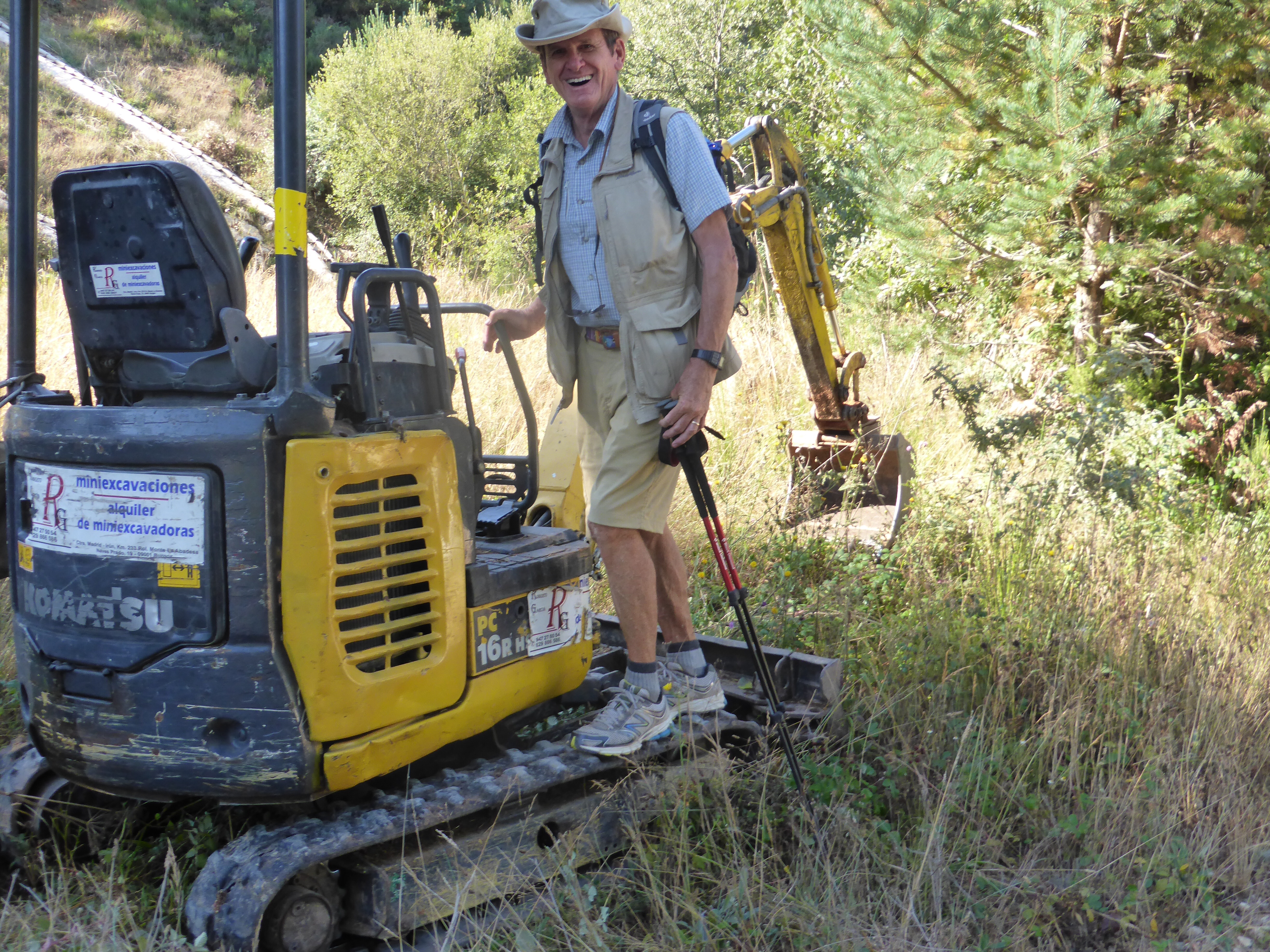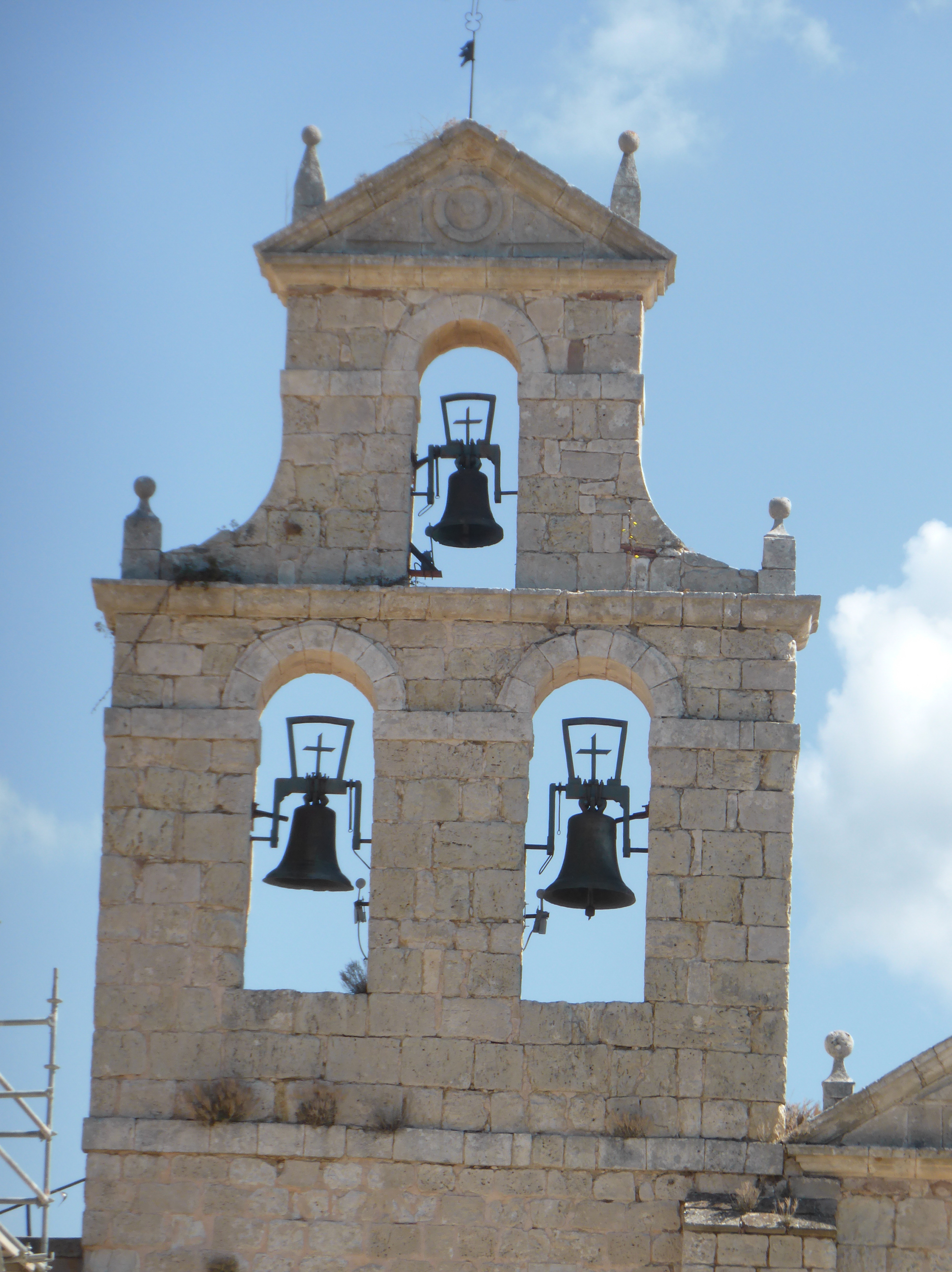 12 th century Hermitage of Saint Felix – who lived in this complete with his eco roof!Pastoral scene as we depart Villafranca Montas de Oca ( translation – ‘the geese mountains) 900 year old church, almost as old as we felt climbing the 1000 feet after leavingOur destination today – 6 hours of walking. This is Atapuerca population 202 (was 200 sixteen years ago). Typical of so many ancient villages – a huge ancient and beautiful church in the center of a very quiet village with many flower boxes and a single cafe, serving good coffee and fresh bread!the bells at the Romanesque monastery, in San Jaun de Ortega, built as a help point for pilgims 1000 years agoPilgrims leave some strange signs…. here concentric circles, the largest 50 feet in diameterYou have to look closely – these tiny blossoms seemingly arise from the dirt without stems or leaves. They appear to have been thrown there but they actually growing there,Suddenly we are almost back up at the 1000 foot level. Here in beautiful pine forrest walking a fire line cut from the managed pine forestNeed Garner and Emmitt’s help hereNot all is good and clear going! Note the ferns – we are in wet climates on rain side of mountains