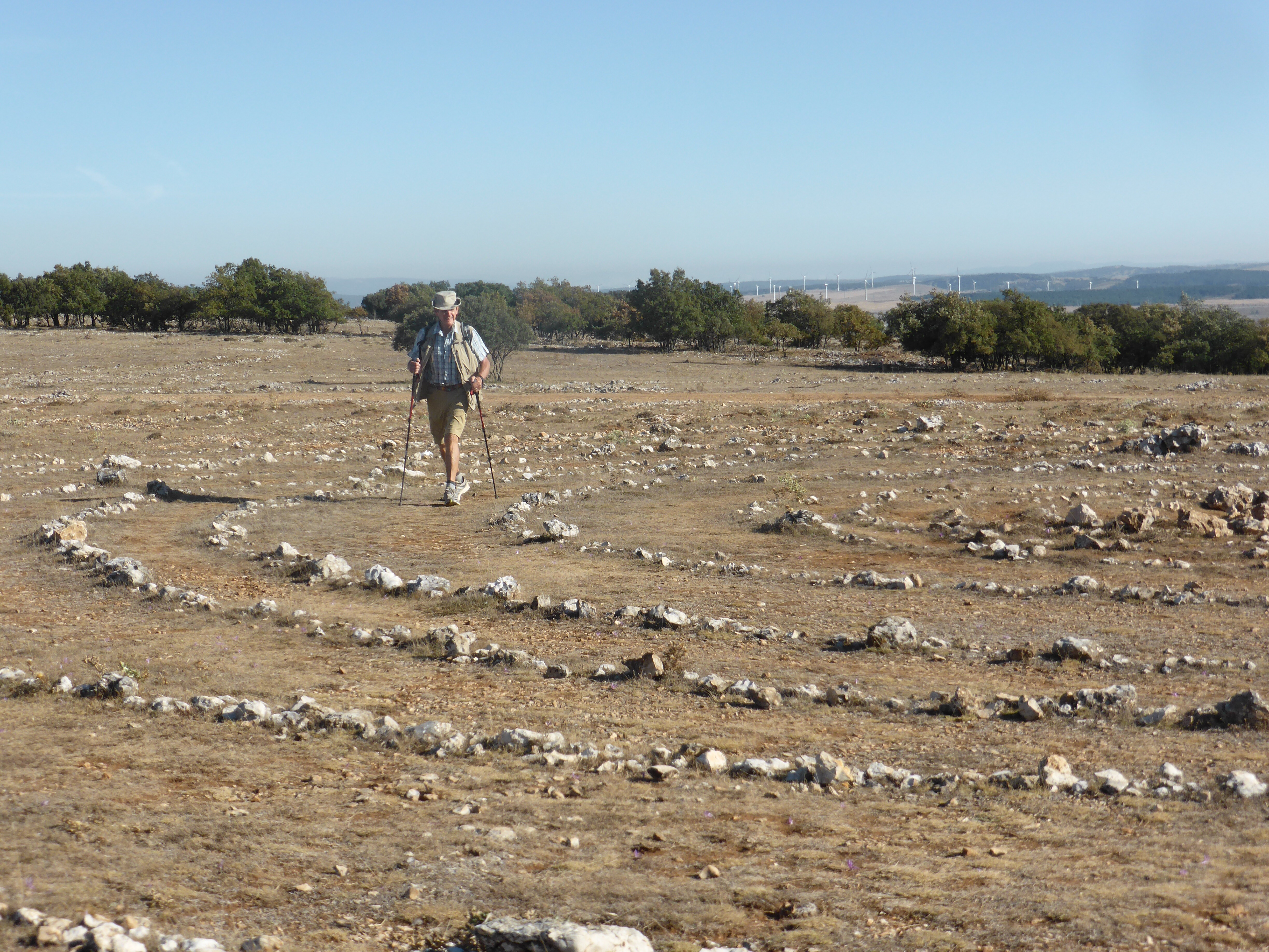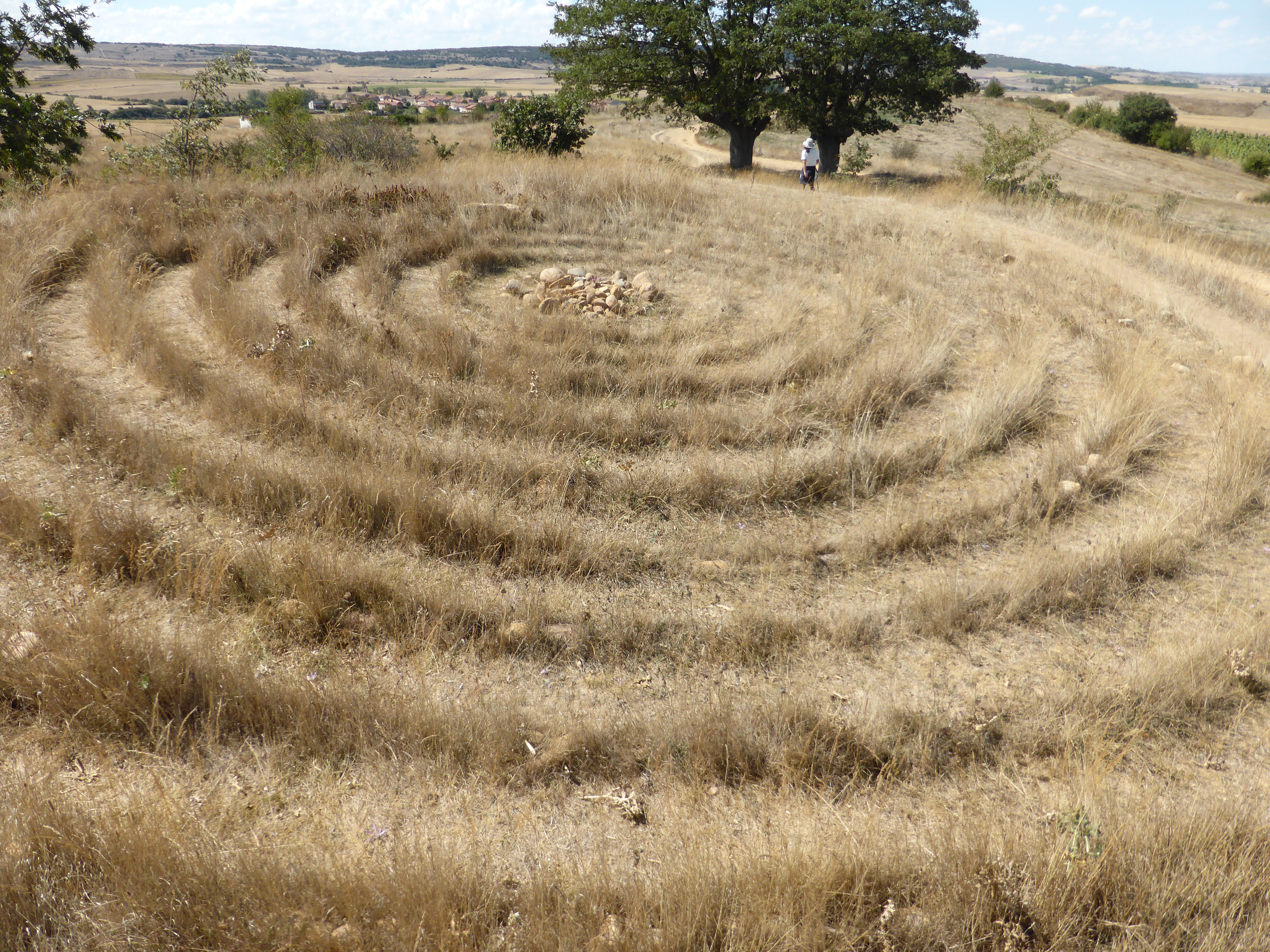 Our funny little hotel in Atapuerca, population 202.Most houses have to be 2-300 years old.This was the scene earlier this evening – what seemed to be a calm Friday evening in downtown Burgos. By early evening the streets were filled, we mean packed. with Spaniards of all ages walking the streets… it seems a routine thing to be on the streets of the inner towns till late at night. Lots of street noise, competing recorded music blaring from almost adjacent storefronts and children yelling. As I type it is after11 pm and it is still very noisy, complete with young children who do not seem to have bedtimes!Walking a 4 -6 km long path through a nature conserve bordering Burgos which has a population of 200,000This is the labyrinth or as some other pilgrims called it a “Prayer Circle”. Many years ago it was started with a cairn and a few stones leading out starting a circle of stones around the cairn. Over time the trail of stones formed concentric circles with each circular trail about 2 feet further from the center. Didn’t count but I would estimate that there were over 20 circles of stones.Here Mutti adds a stone for each of our families. Dad spent a few moments walking a few of the inner circles, he felt it very moving to think of the thoughts and situations behind the stones placed so long ago.The steep climb to the top of the Matagrande ridge was a bit of a challenge. A couple of kms of rough going, great for goats.