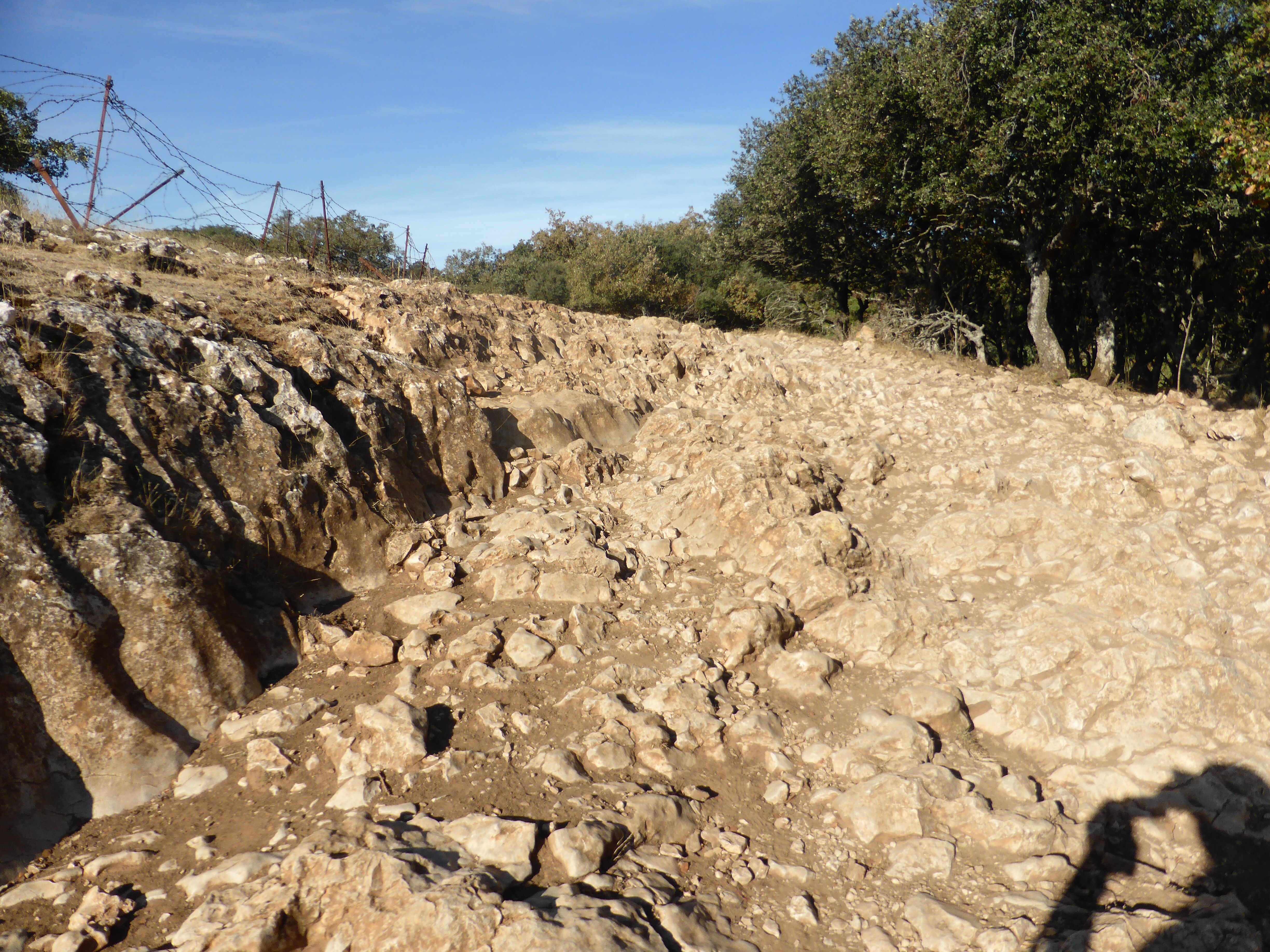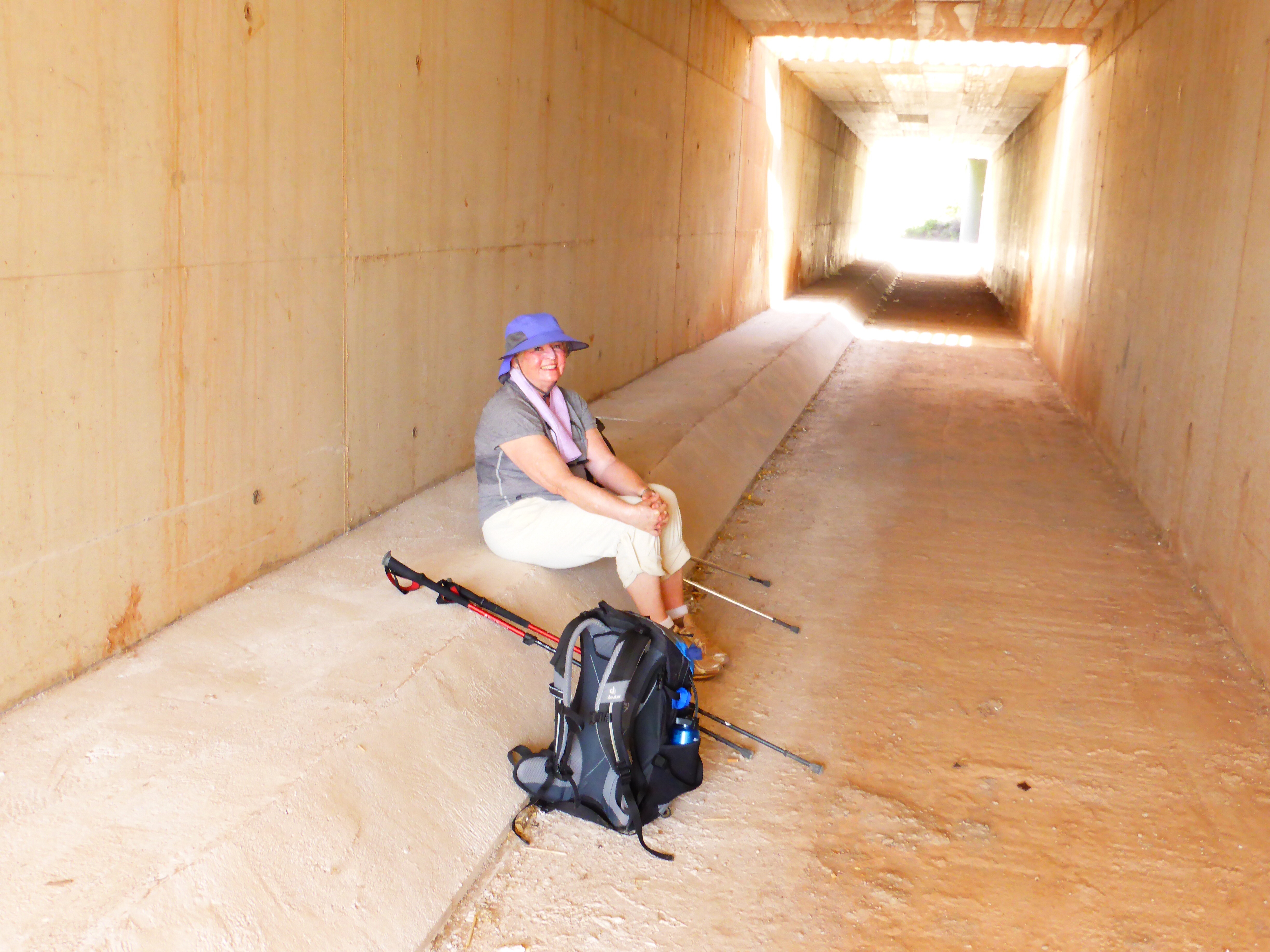 An example of the terrain changes. Here the bluffs behind the town of Najeta. Note how red the sandstone. This resulted in fine red earth soil but for only 20 km until we got back to the so very rocky soil that seems most suitable for the vineyards.Off in the distance, a rock built, igloo like structure that could house 10 or a few more. We understand that these are used to accommodate the seasonal grape picking migrant force from Africa.Many of you reading this will remember our beloved dachshund “Yeager”…. We felt for sure that this was our old buddy and not a tree line on the horizon.That’s not Mutti waiting for a bus… During our cross country jaunt we needed some rest and shade. We found cool protection in a water culvert tunnel.We did something a bit off piste today. Seeing that the Camino course was going to be longer and with a higher pass, we decided to cut out on our own. Part of our overland ( and dale) route took us through vineyards and really basic dirt paths. It was hot and dirty going. Don’t think we will try that again. If the proven Camino path is good enough for the hundreds of thousands before us, we accept that it is good enough for us.Pretty hard to see but there is a viaduct running across the hillside. Much of this area is served by an extensive interconnected cement viaduct system to distribute the valuable water