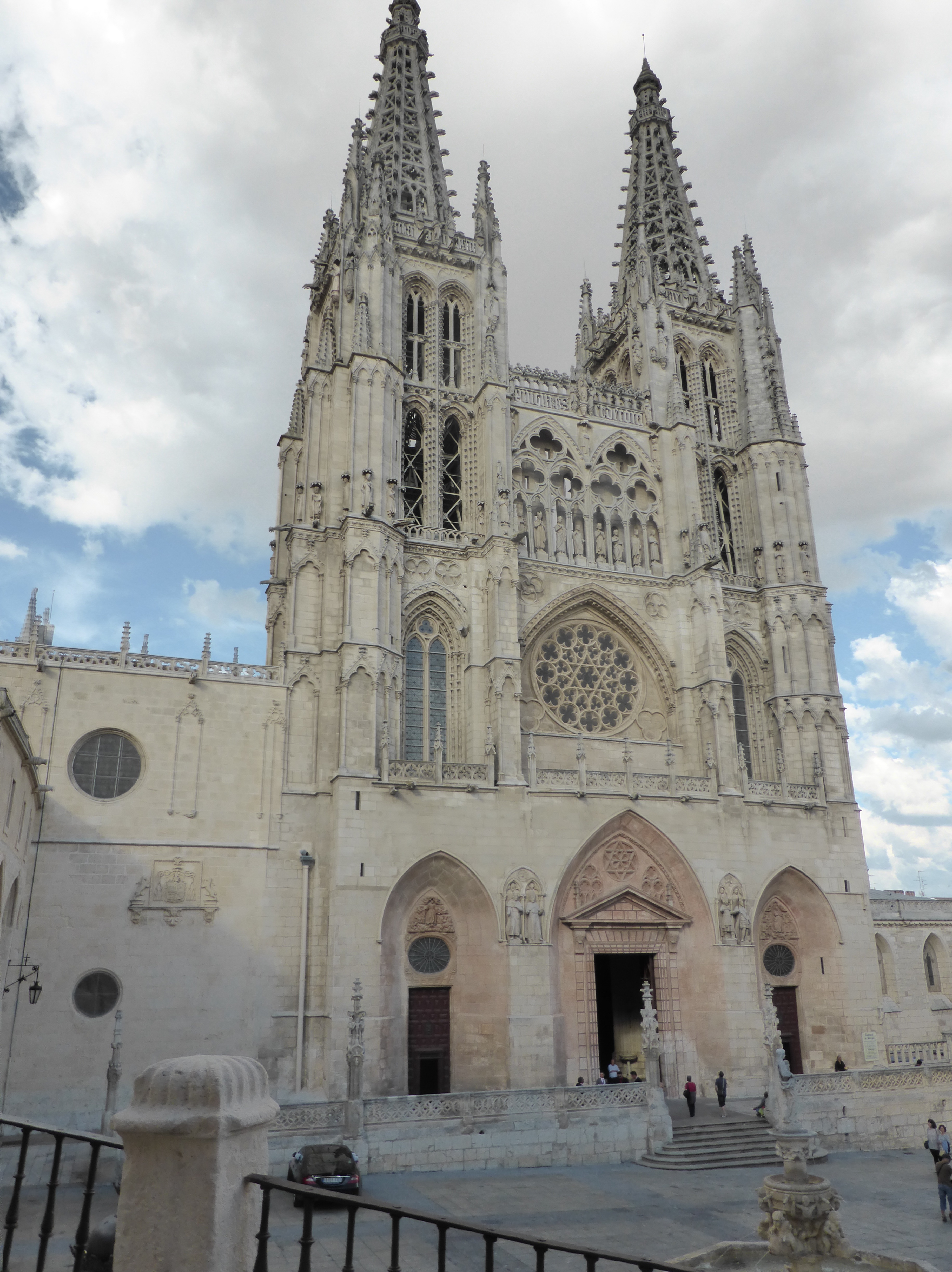 Burgos is a lovely city—-well planned and clean. All along the Rio Arlanzon there are park lands. The streets on either side of the river have many inviting outdoor cafes. Burgos is the capital of Burgos province in the Castile area of Spain and has population of 178,000. It is best known for its Gothic architecture, primarily the Catedral de Santa Maria built in the 13th century. This cathedral is known as the wedding cake cathedral because of its ornate spires. El Cid ( aka Rodrigo Diaz not Charlton Heston) the Castilian hero was born near Burgos. His body lies In the cathedral.