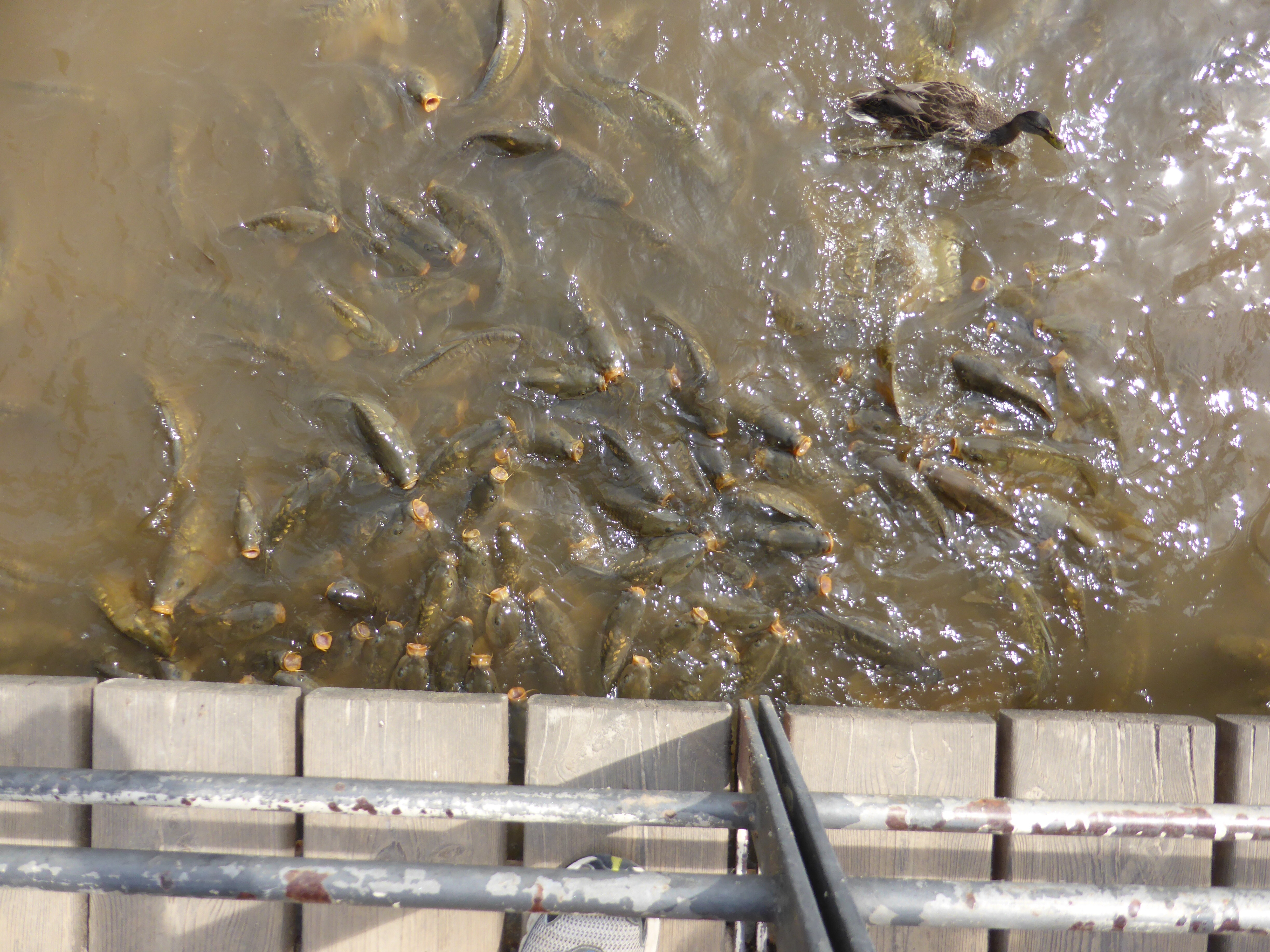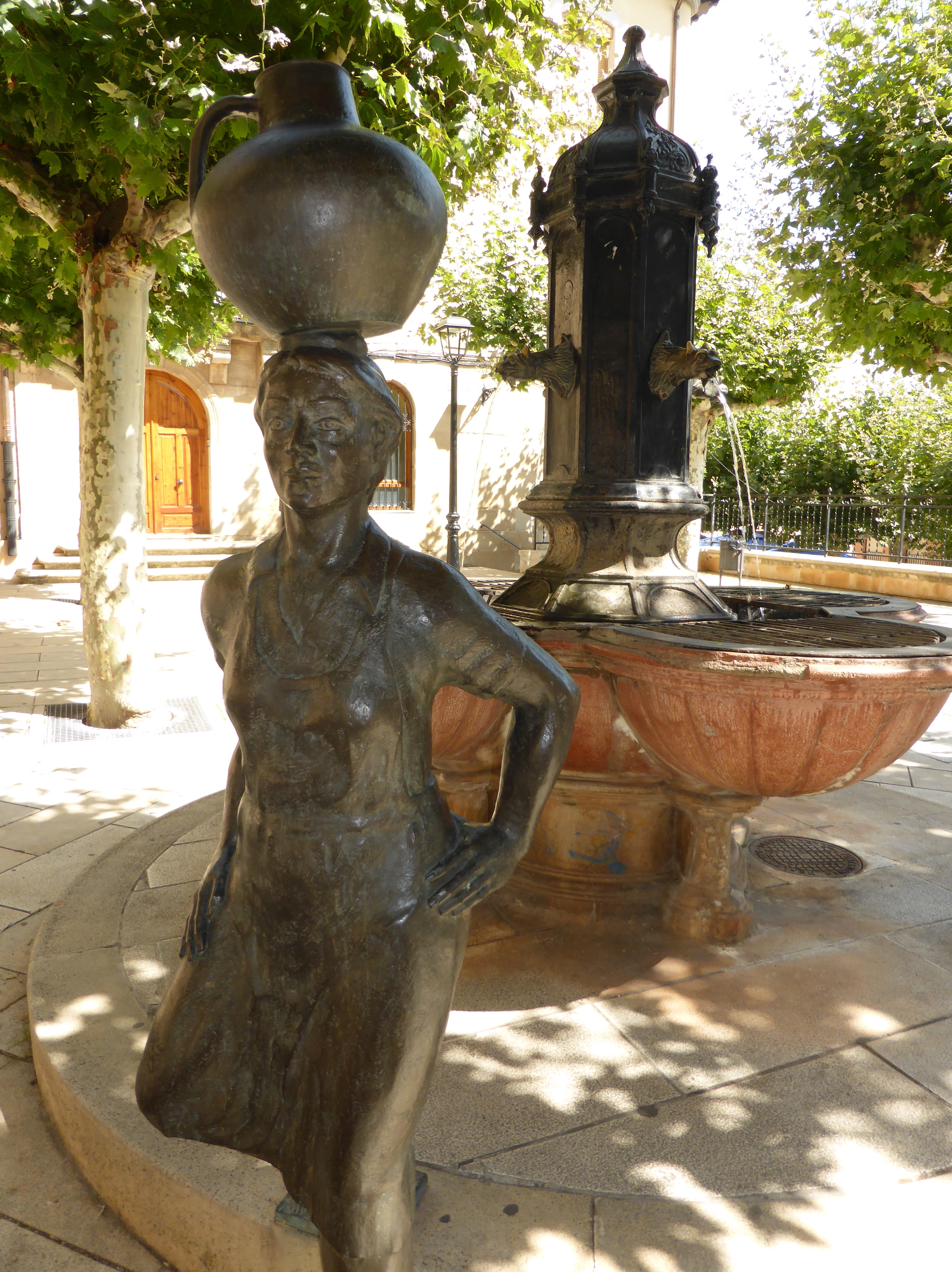 A statue in the town square – that’s a wine container on the bronzed statueThis is a funny one. This is a picture looking straight down into the water below a small bridge. Pictured are many carp, and a single duck, all fighting for the cookie crumbs that Rod dropped into the water.A giant stylized bottle of wine from the winery just outside the town we are in – Navarrete. A bottle of some of the local wines sells for as little as $3 – it is considered food and therefore not taxed!a Camino water tap… Rods poles beside. The poles are an absolute must. Makes for much easier climbing and safer descents. Thank you Heather!An upscale pintxos bar…(we know it as tapas- a diagonal slice of French bread with all sorts of different meats, cheeses, veggies, fish, you name it. Three is a meal.