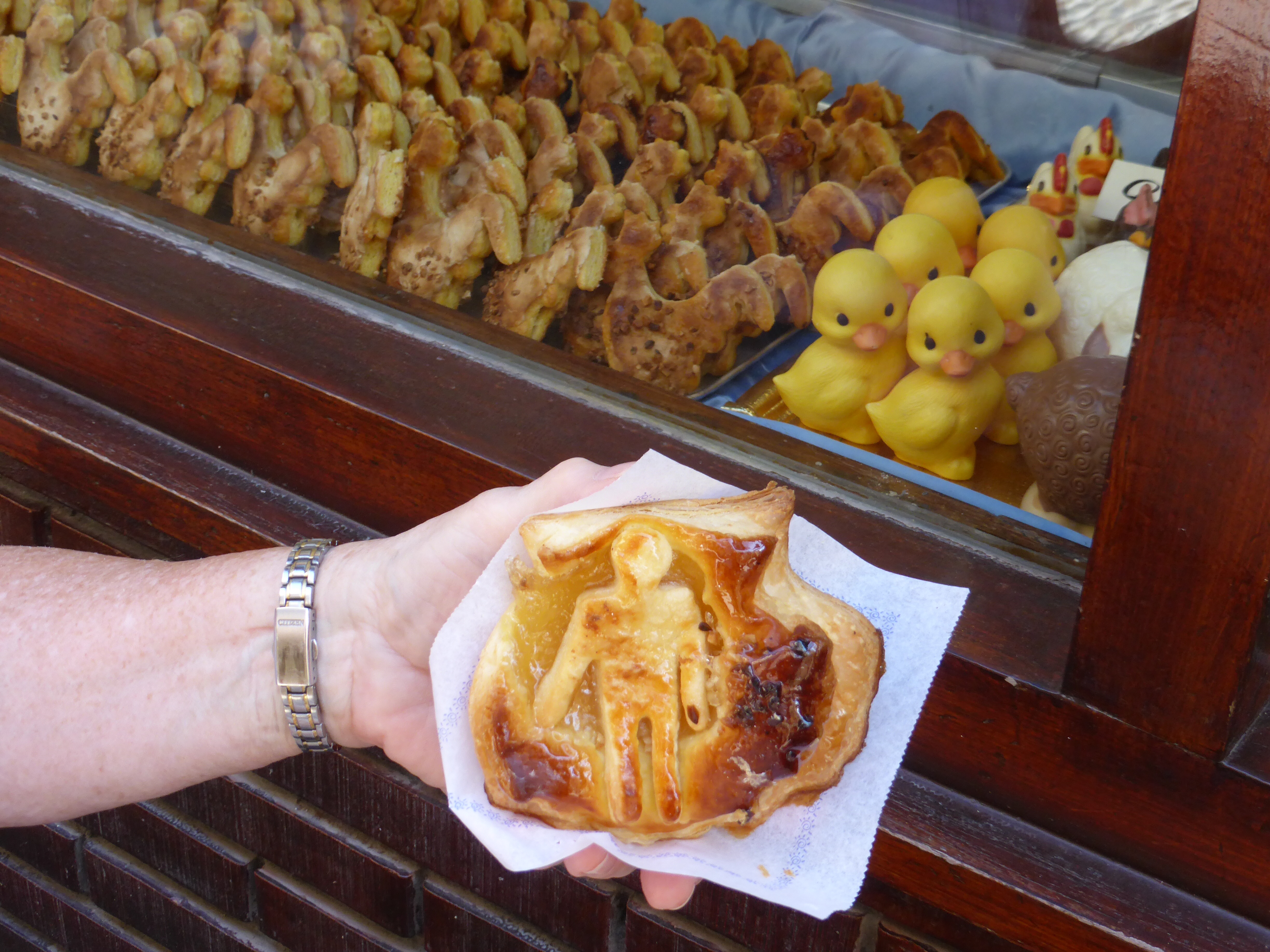 A day for coffee and treats.Amazing the people you meet , here is Zoltan from Hungary. He is on the last leg of his 15 month around the world bicycle tour. He did the Camino 10 years ago – it changed his life. Still owns his pizza shop but lives a very simple and basic life and is very happy to have shed most of life’s trappings. Amazing bike – latest in efficiency, he even has a solar powered cell phone!This is a potato growing area – here is the mascot for the local potato company – for the grandchildren!An Auberge ( a hostel) here in Spain an Albergue – very basic communal accommodations costing from 5 to 10 Euros a night ($7 – $14) used by the majority of pilgrims. I snuck into the one here – this picture is the “boot room”Called the “Ahorcaditos” – a local specialty – an almond pastry depicting the Pilgrim on the Camino Shell. Very good! For all the Grandchildren,check out the yellow pastry ducks!!