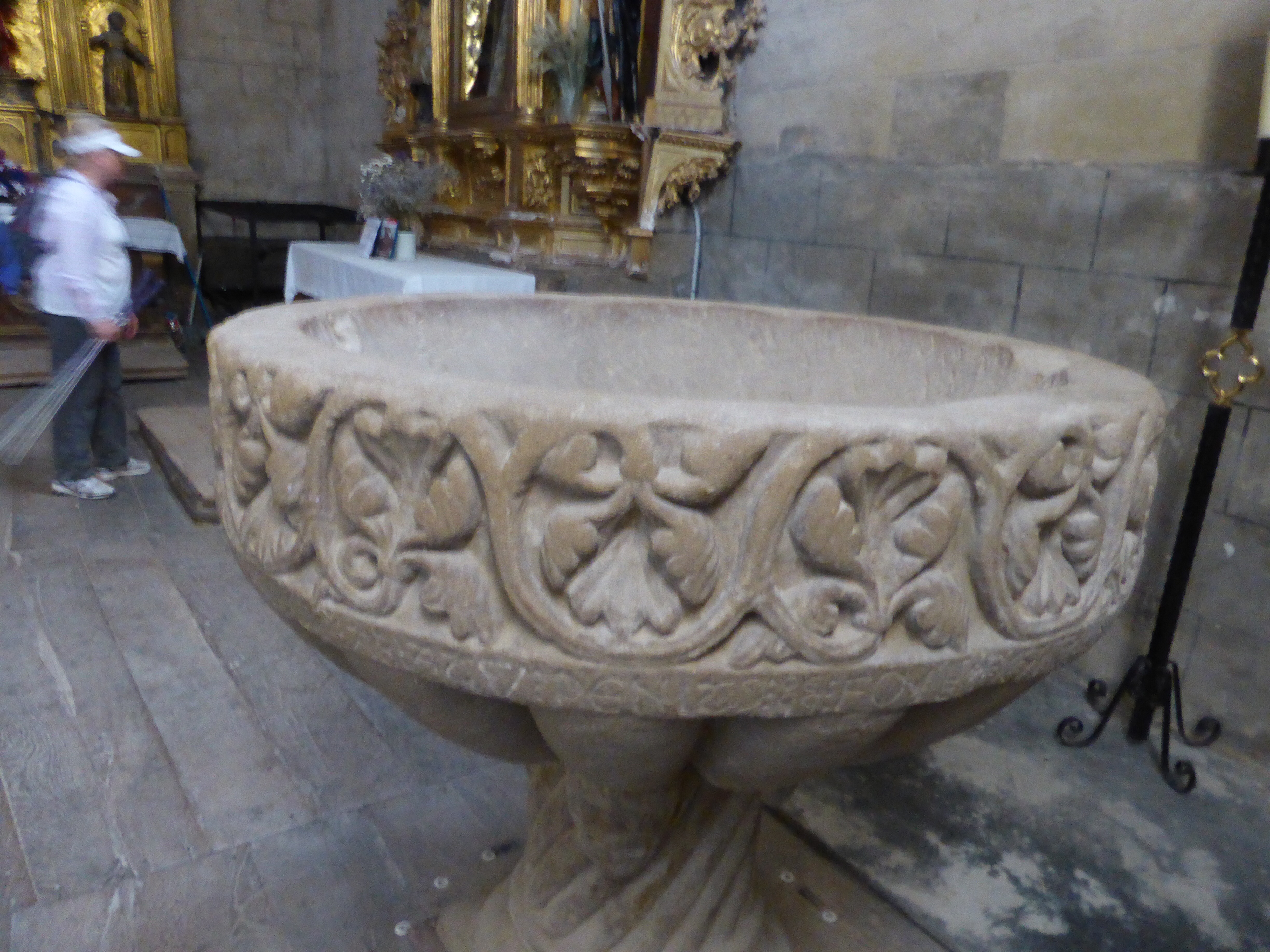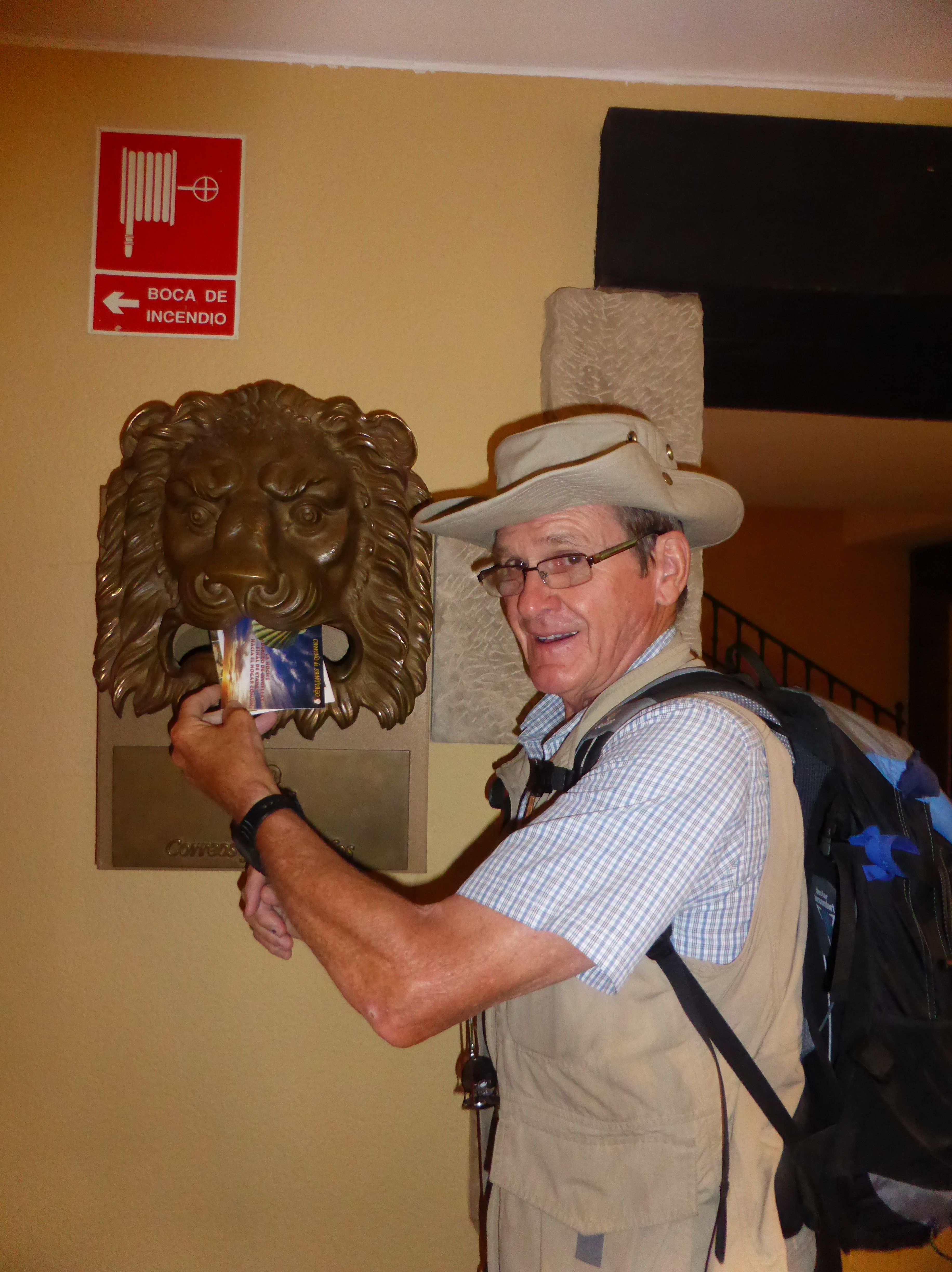 For all the Grandchildren – we are always sending you postcards even if we have to risk being bitten by a lion!Our hotel room tonight. Love the old outside rock wall. Probably over 300 years old. Run by a hard working family who keep it squeaky clean.We thought this was our hotel ….. Something out of the old west!A friend we met along the wayThe boot / shoe room. All pilgrims remove their out door footwear in the auberge where accommodation is less than $15 a night. We ate at one tonight where the accommodation was less than $7Every town has a ” Calle Mayor” – translation: High StreetThat is a field of onions being picked and for Garner: that is a BIG RED TRUCKThought we were leaving Moose Jaw for Swift Current!!A 600 year old baptismal fontThis is the church that serves a town of less than 1500 people. It was built almost 600 years ago. Ladysmith is just over 110 years old.