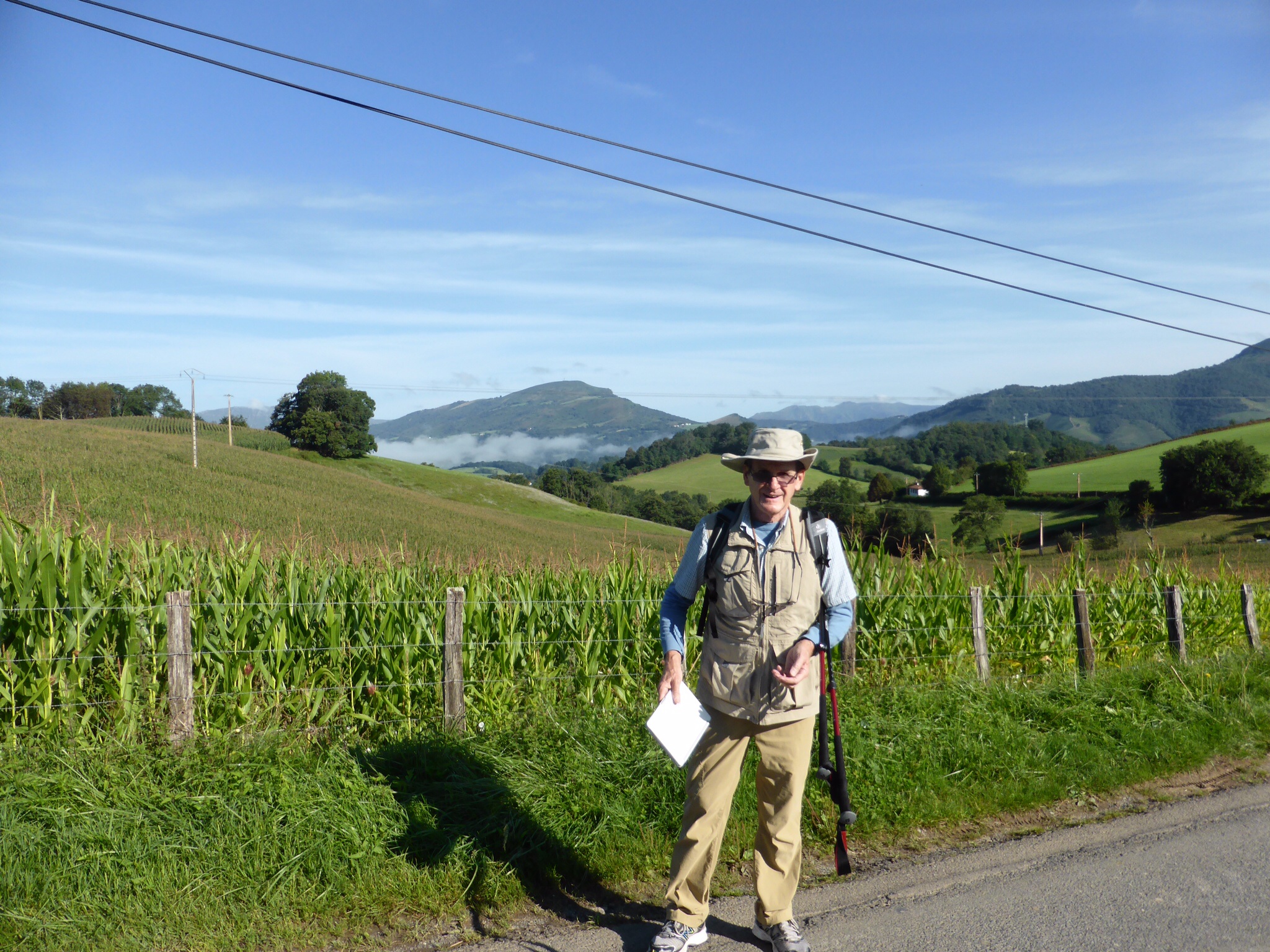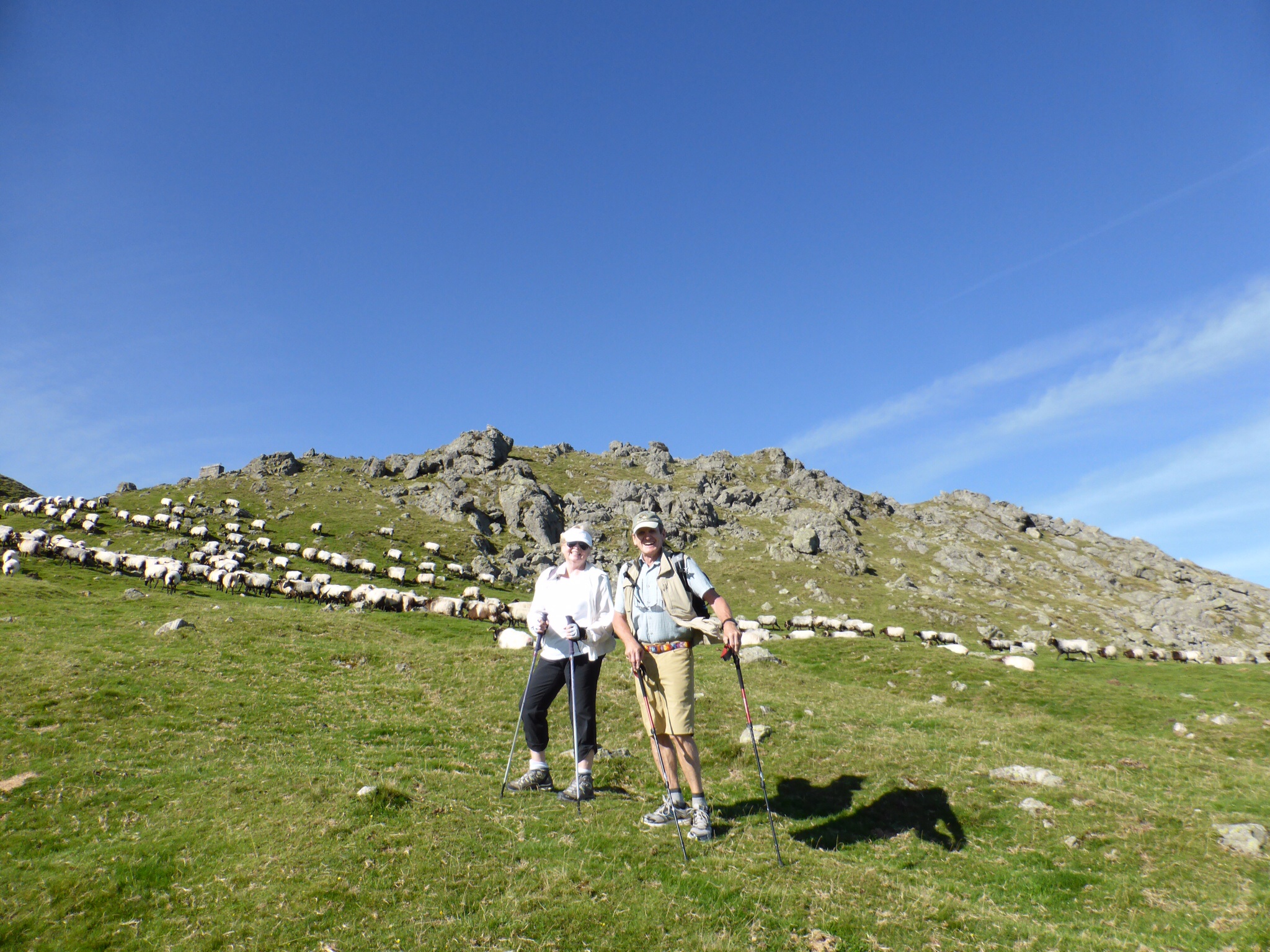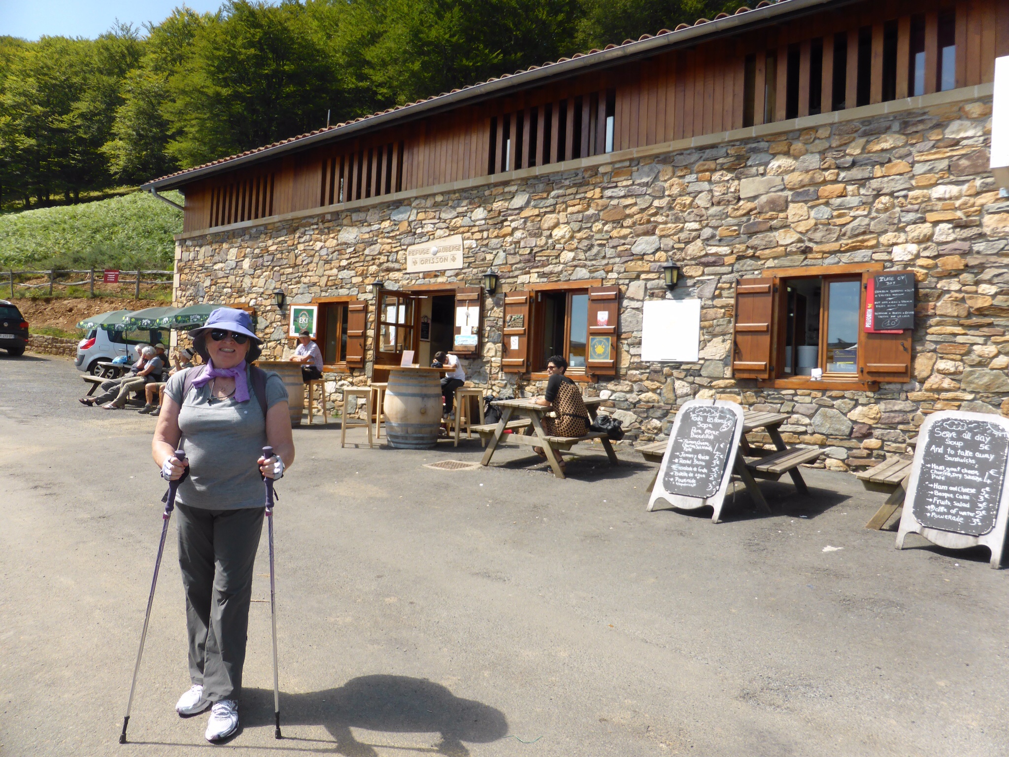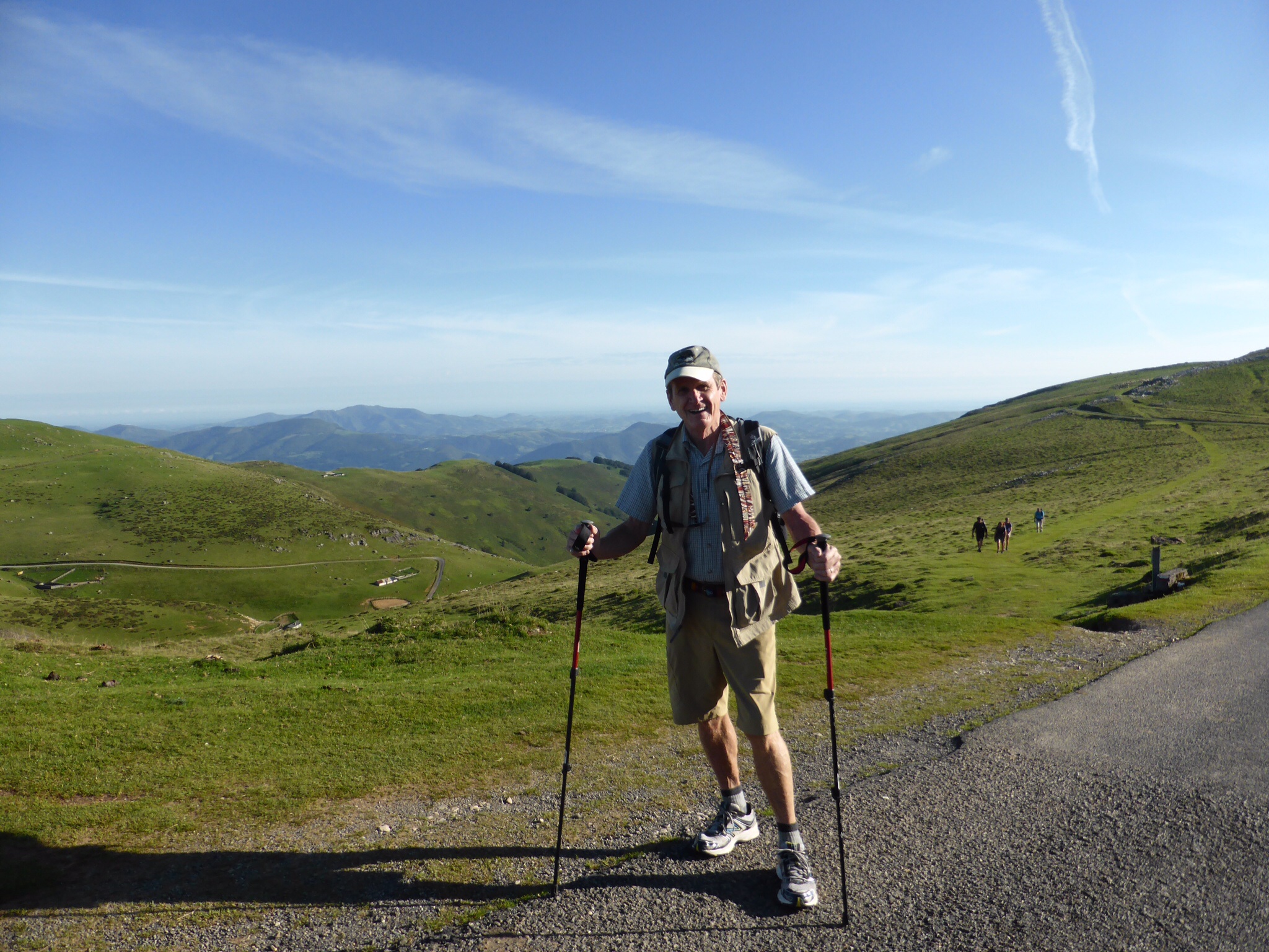 We are excited and a bit anxious. This is the first portion of the Pyrenees climb. As it is designated as “difficult” we are climbing ½ way this day. A van will return us to St. Jean and then take us back to Vierge d’Orisson the next day. (There is no accommodation at VO). It is warm and sunny. The skies are an incredible cerulean.We pass through the Spanish Arch and after taking a photo for mother and daughter pilgrims, we start walking. Our mood is joyful to actually be here and doing this. How blessed we are! Our steps are light a d our pace easily 5km/hr. The hills begin. The day gets warmer. The hills are “alive with the sound of cowbells”. There are sheep and cows everywhere, paying us no attention as we trudge by. This “bell choir” gives a strangely comforting accompaniment to our day. Other pilgrims pass us and later we pass them—always with a wave a smile and “Buen Camino”—“good Camino”. The beautiful verdant hills seem endless now—and higher. Dad keeps reassuring me that it will level out around the next curve. It does not. It is very hot and we are very tired. Everyone we see looks exhausted. Finally, we reach our destination…..and we wait…..and we wait….the van is not there and does not seem to be coming. We begin to walk back. Downhill is easier for a while. We walk almost 3 km when the van arrives—an hour and a half late. Some mix up….we are just glad to be going back to St. Jean.