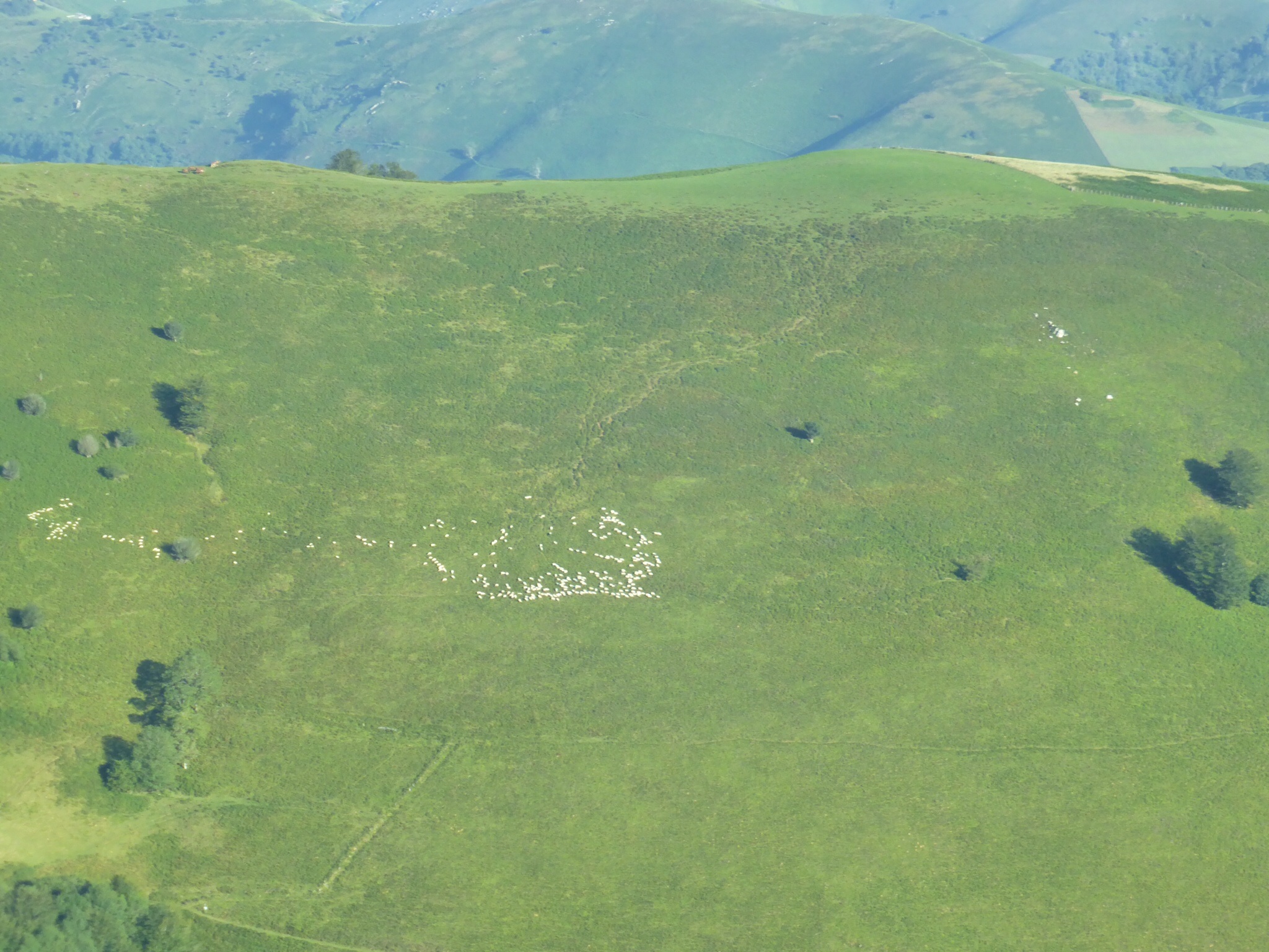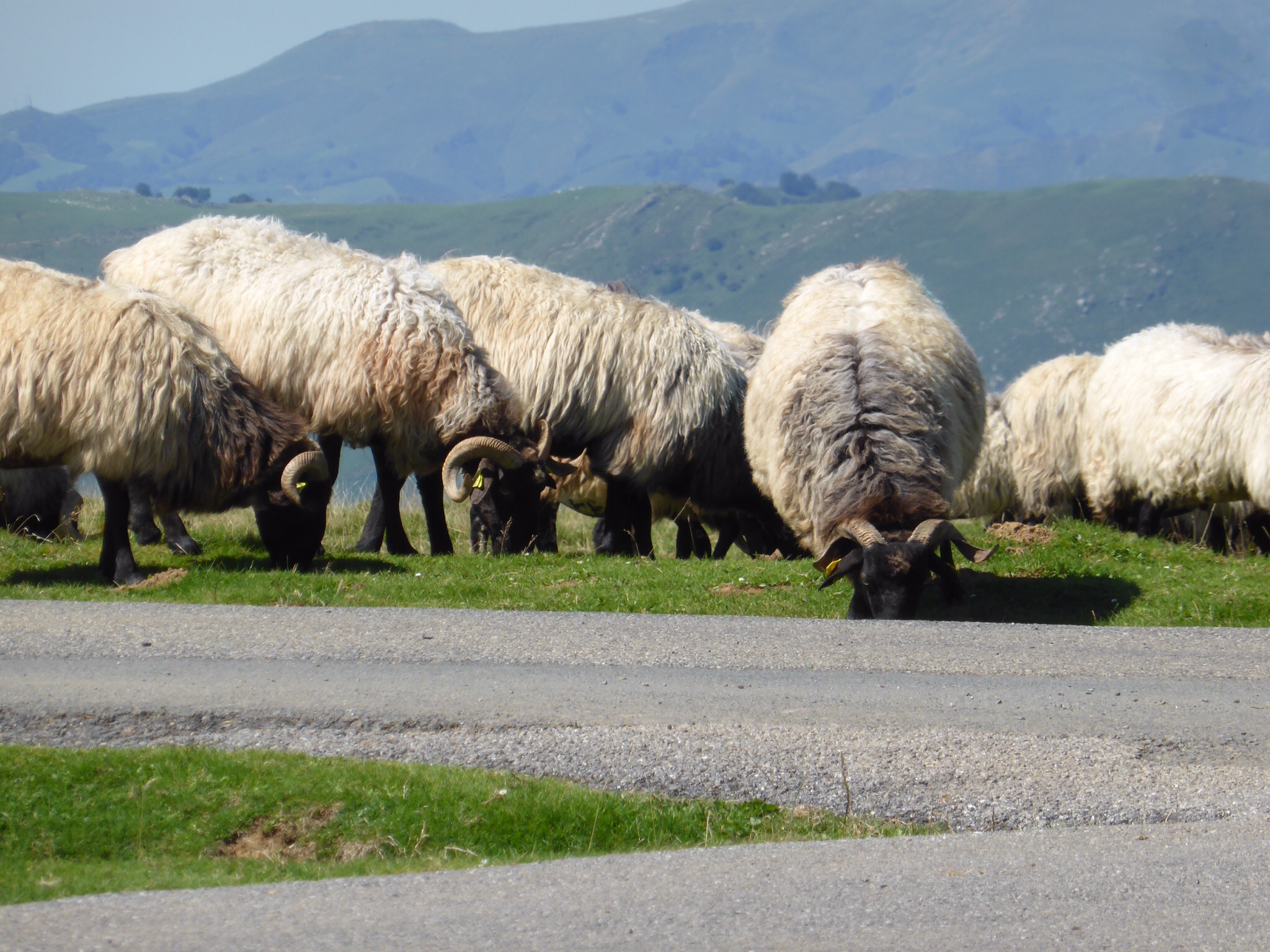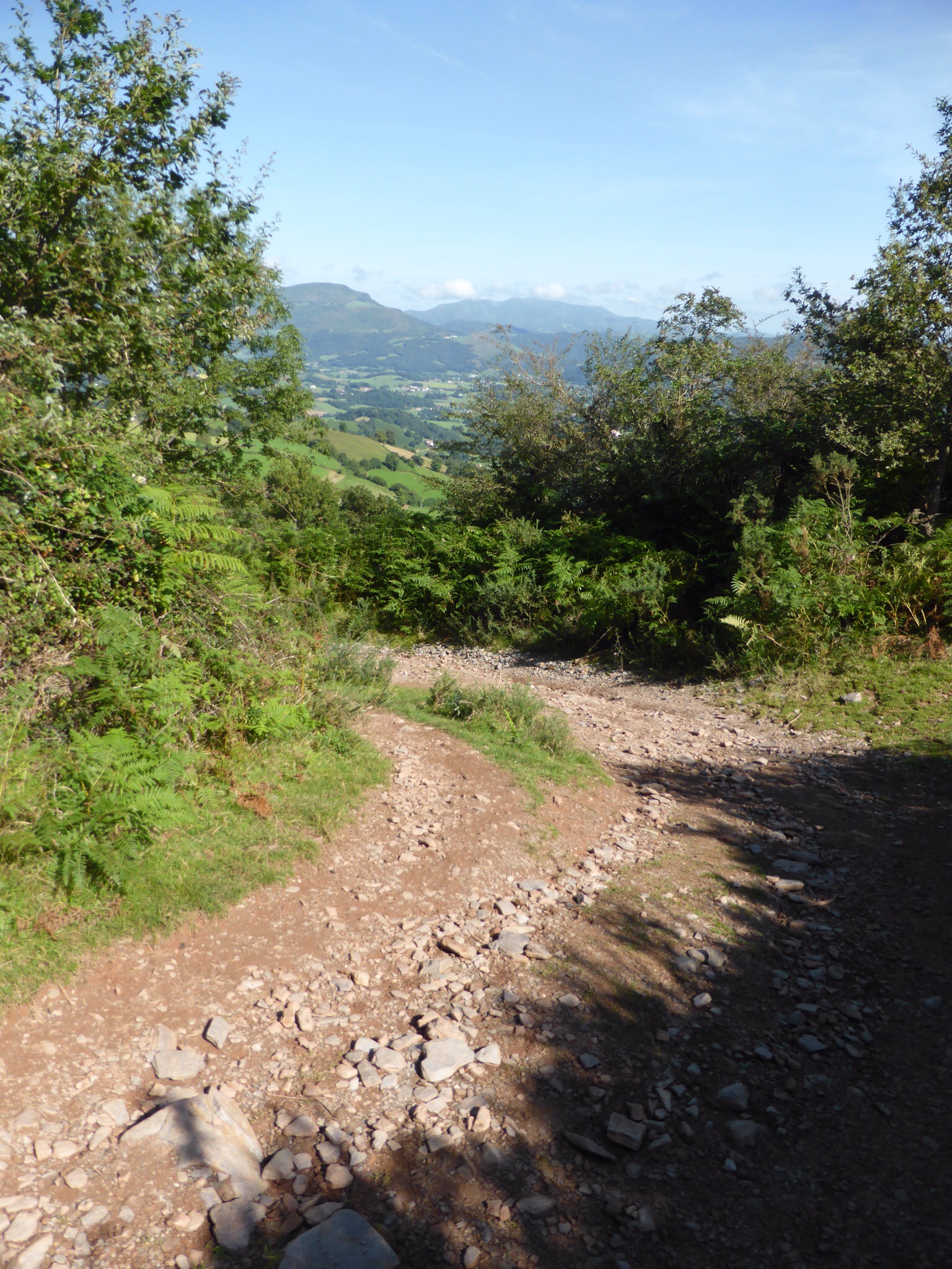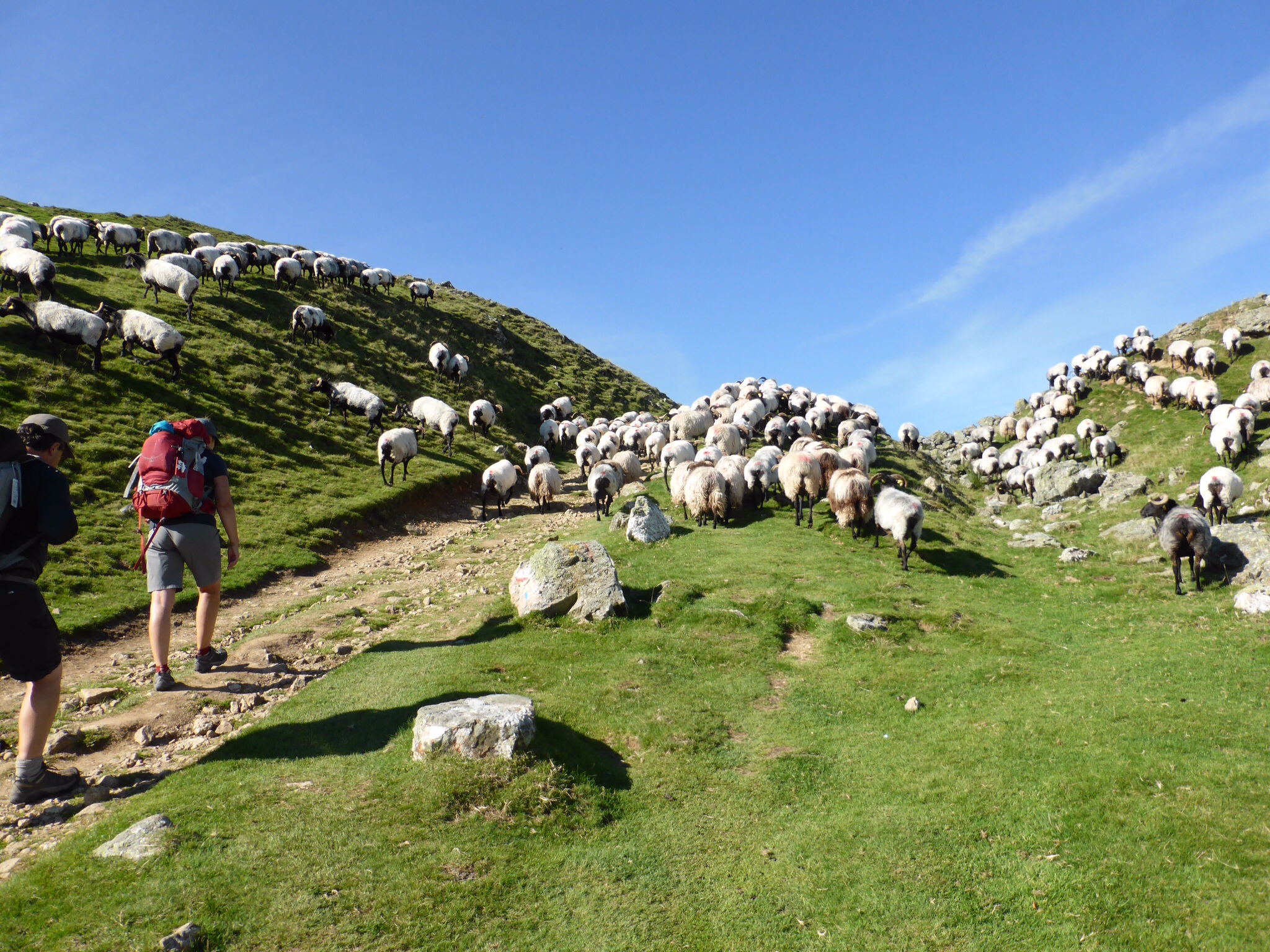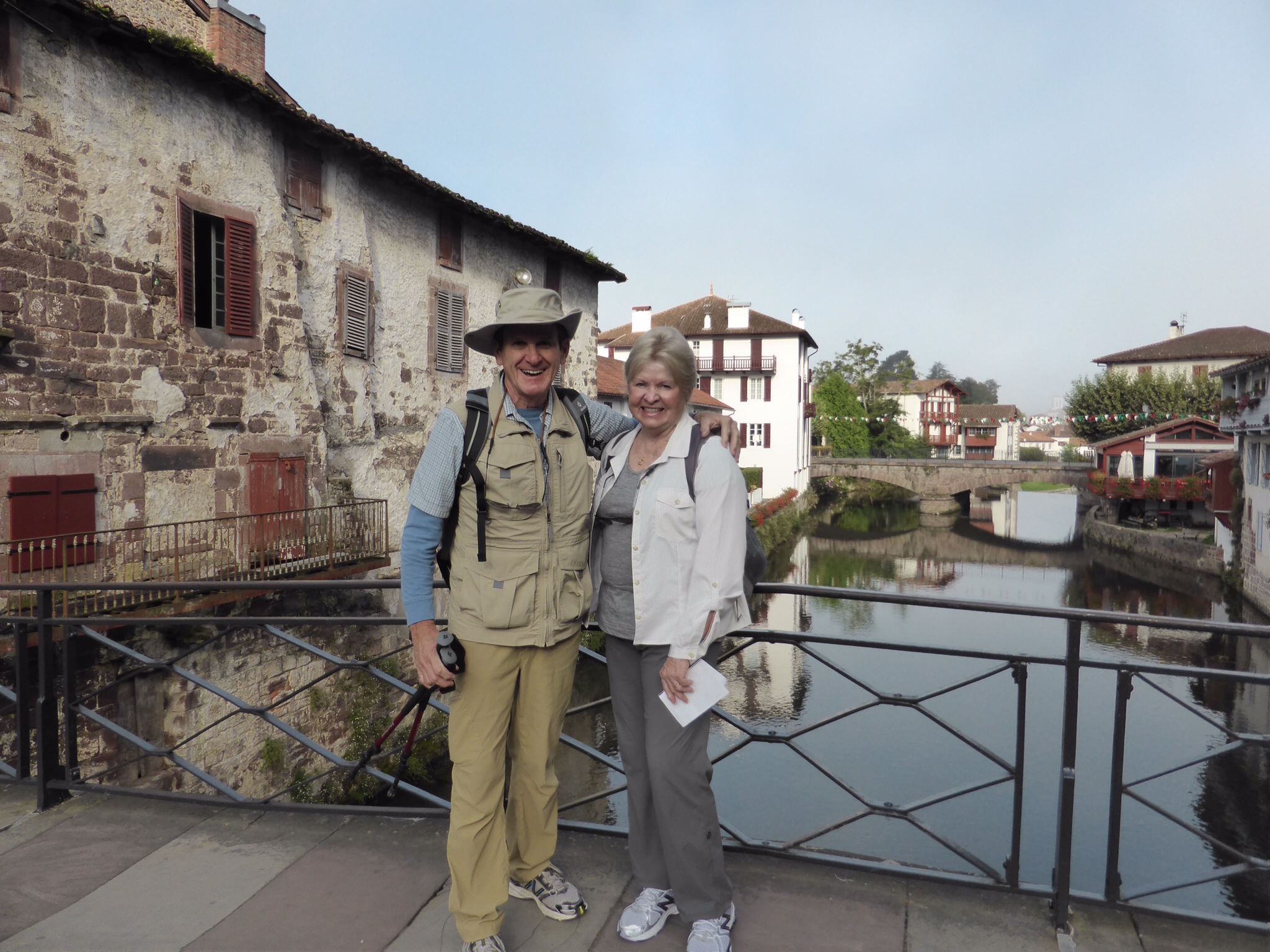 We are excited and a bit anxious. This is the first portion of the Pyrenees climb. As it is designated as “difficult” we are climbing ½ way this day. A van will return us to St. Jean and then take us back to Vierge d’Orisson the next day. (There is no accommodation at VO). It is warm and sunny. The skies are an incredible cerulean.We pass through the Spanish Arch and after taking a photo for mother and daughter pilgrims, we start walking. Our mood is joyful to actually be here and doing this. How blessed we are! Our steps are light a d our pace easily 5km/hr. The hills begin. The day gets warmer. The hills are “alive with the sound of cowbells”. There are sheep and cows everywhere, paying us no attention as we trudge by. This “bell choir” gives a strangely comforting accompaniment to our day. Other pilgrims pass us and later we pass them—always with a wave a smile and “Buen Camino”—“good Camino”. The beautiful verdant hills seem endless now—and higher. Dad keeps reassuring me that it will level out around the next curve. It does not. It is very hot and we are very tired. Everyone we see looks exhausted. Finally, we reach our destination…..and we wait…..and we wait….the van is not there and does not seem to be coming. We begin to walk back. Downhill is easier for a while. We walk almost 3 km when the van arrives—an hour and a half late. Some mix up….we are just glad to be going back to St. Jean.